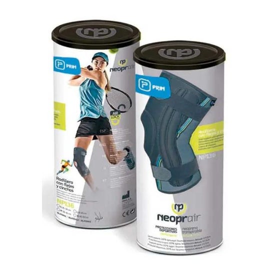 Genouillère Prim Neoprair avec Éléments et Sangles TS 1ud est une genouillère en néoprène respirant conçue pour stabiliser la rotule. Son matériau en néoprène de 3 mm d'épaisseur offre une compression en 3D et permet une ventilation adéquate.