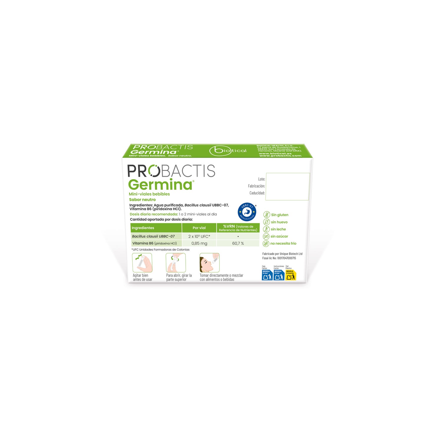 Probactis Germina Saveur Neutre 10 Mini Flacons est un probiotique formulé à base de Bacillus clausii UBBC-07® et de vitamine B6.