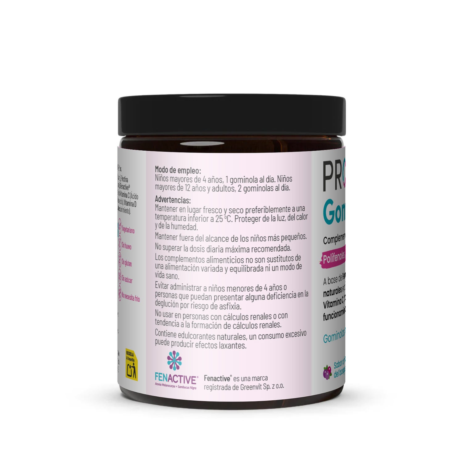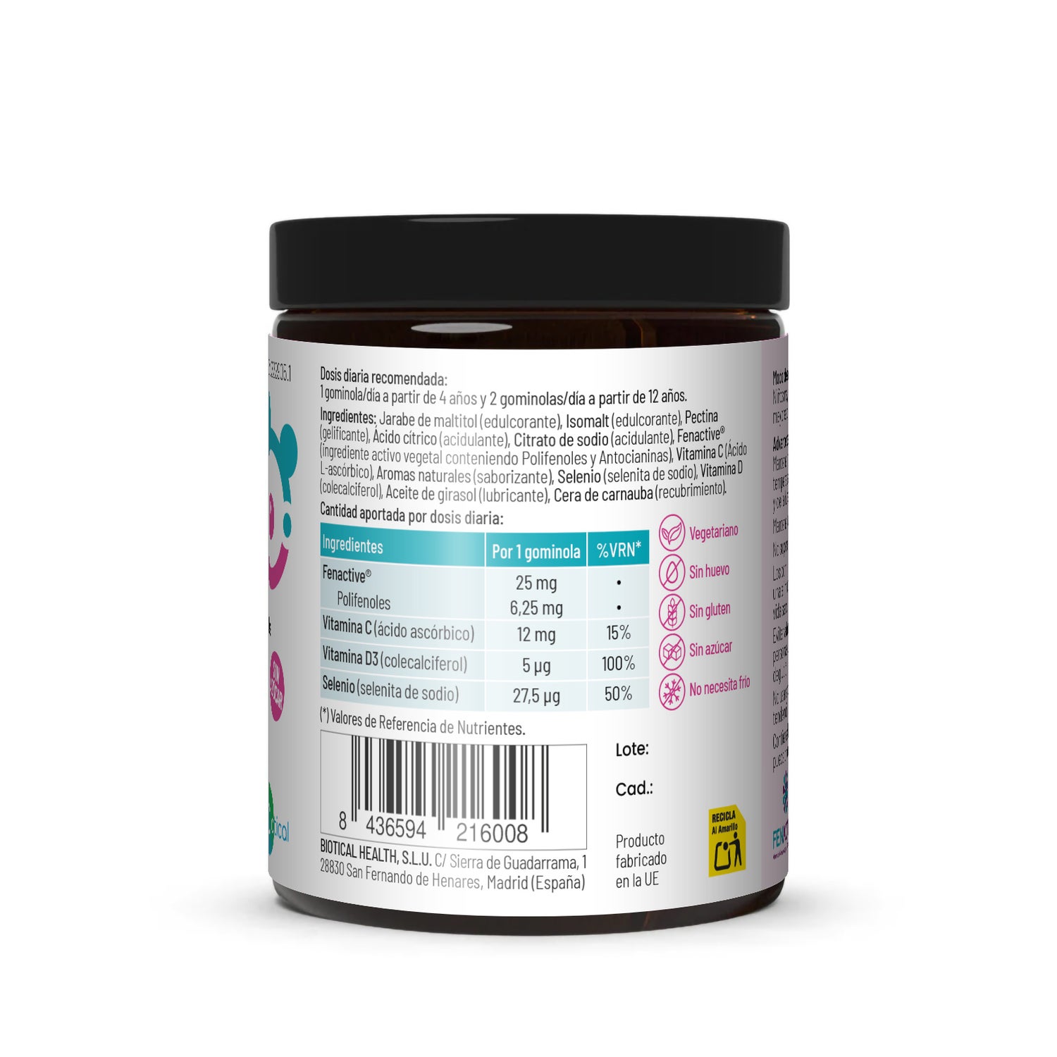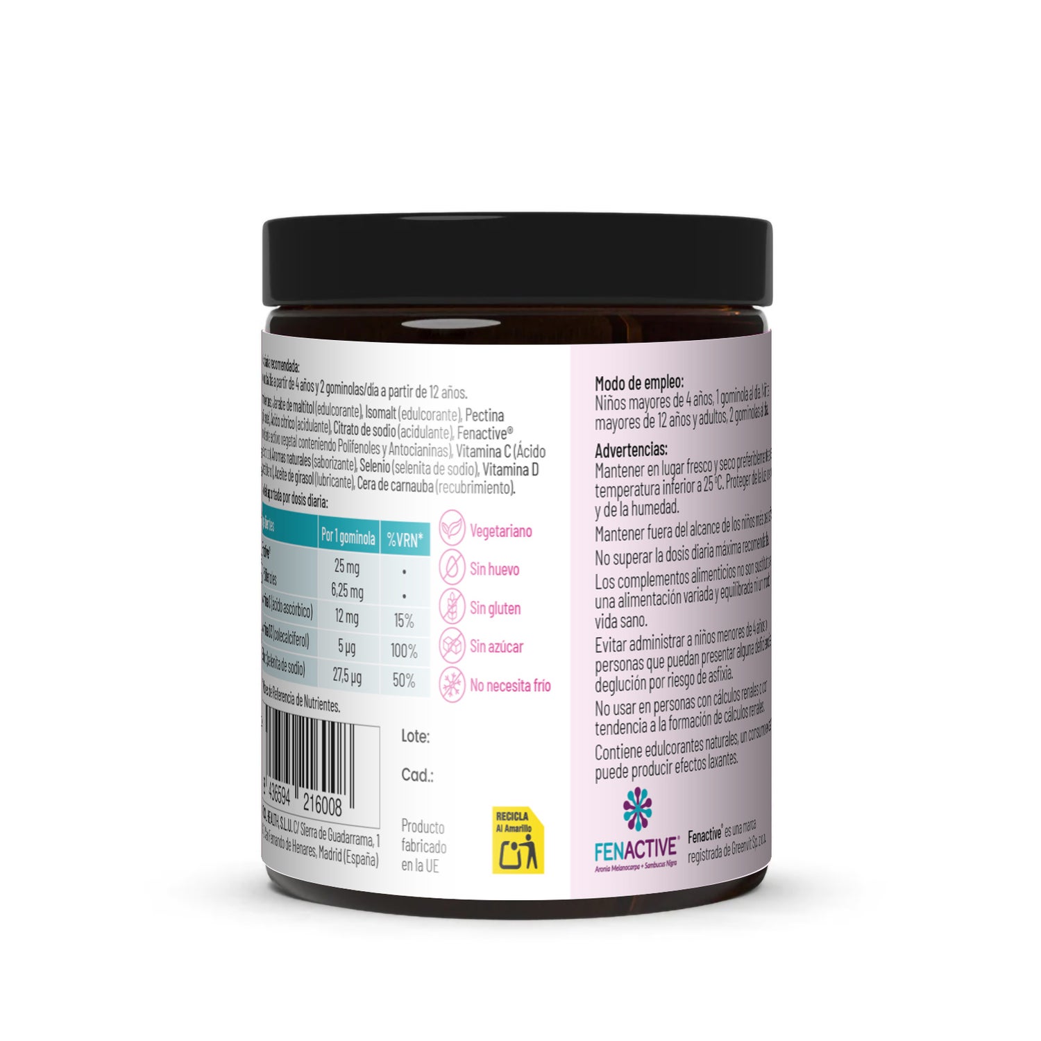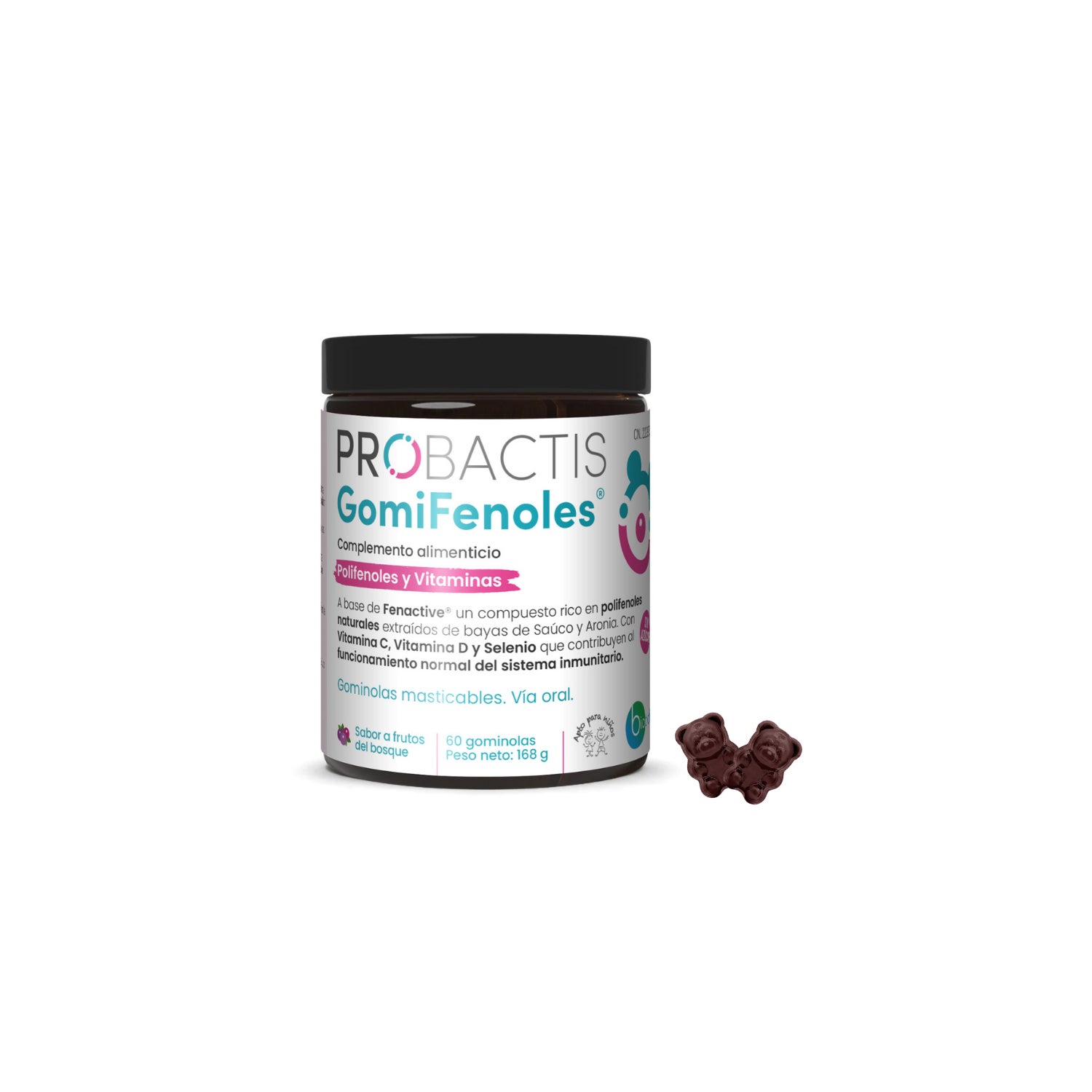 Probactis Gomifenoles® sont des gommes à mâcher formulées avec Fenactive®, un complexe breveté riche en polyphénols naturels extraits de baies de sureau et d'Aronia, de vitamine C, de vitamine D et de sélénium, pour renforcer le système immunitaire des enfants et des adultes.