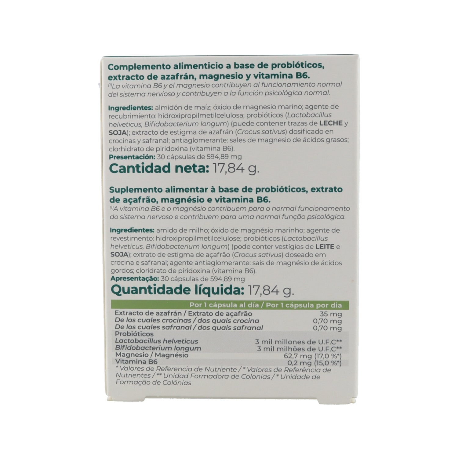 Probiotiques, extrait naturel de safran, magnésium, manganèse, vitamine B6 ;