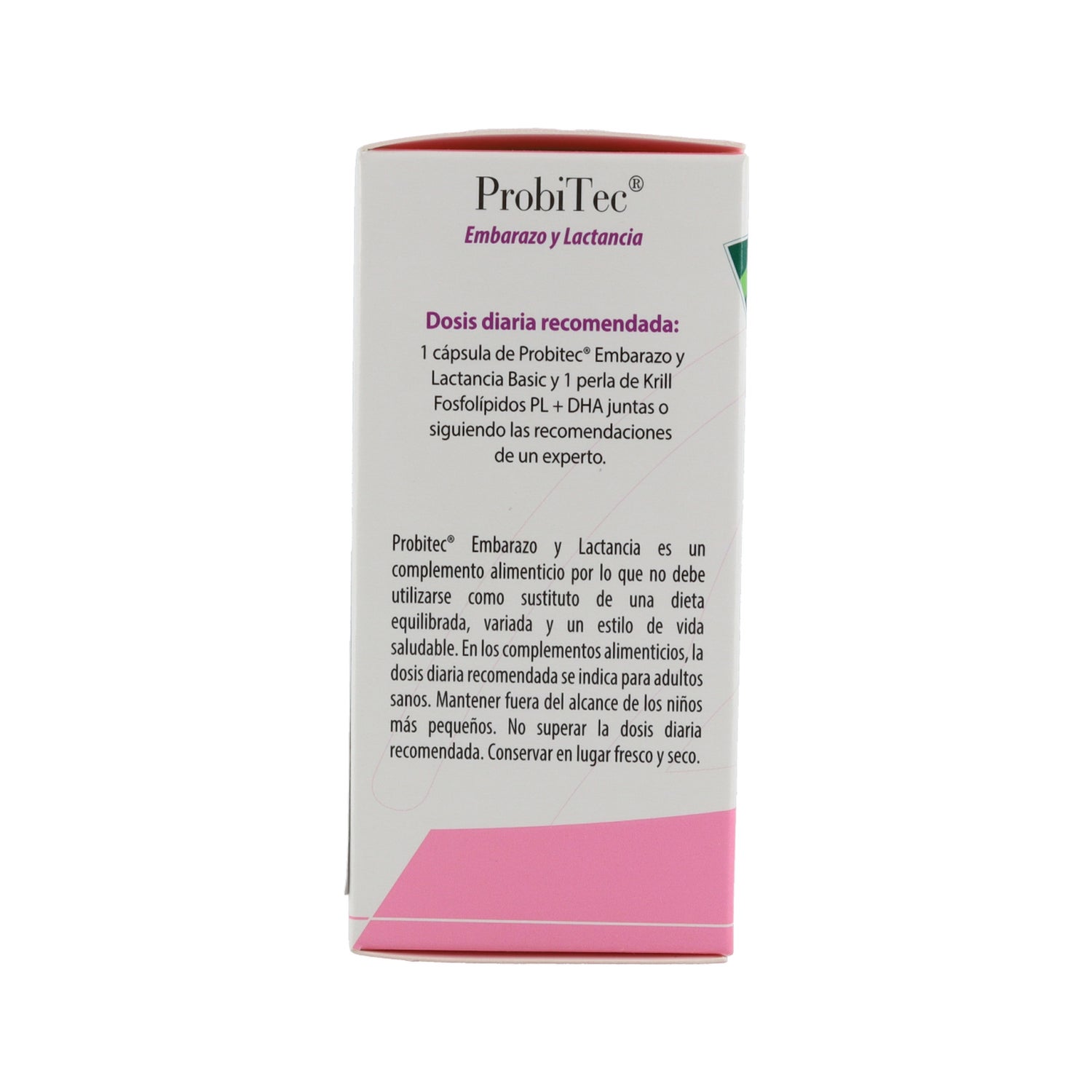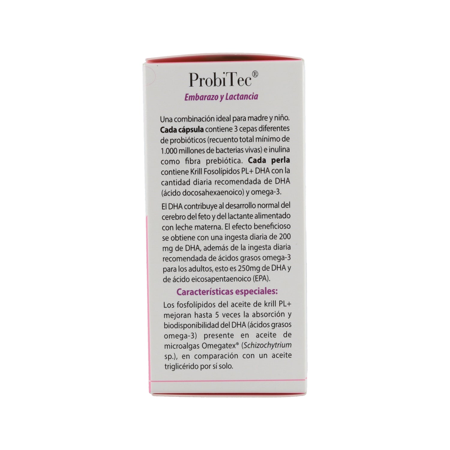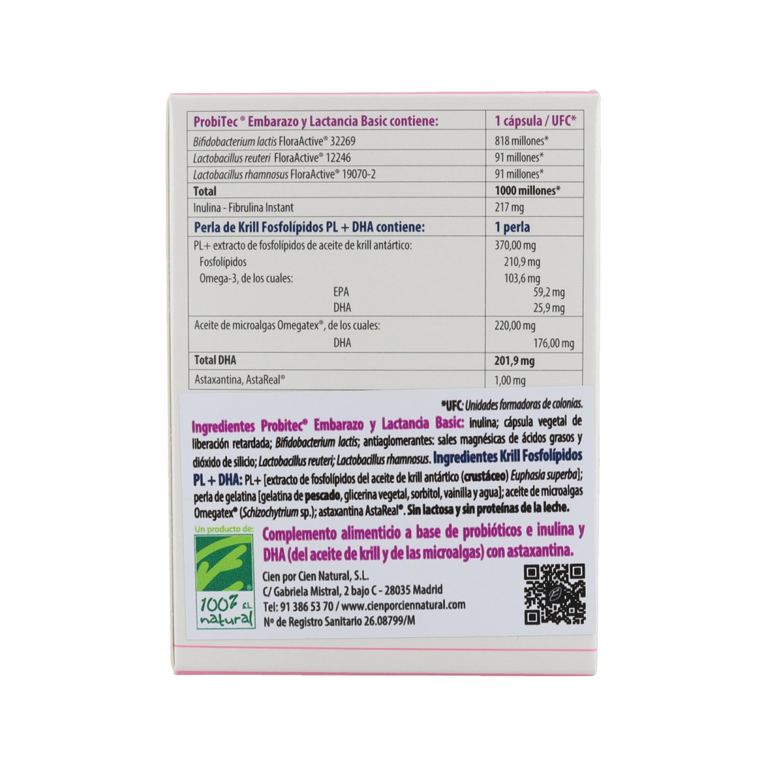 100% naturel Probitec Grossesse & Allaitement 30 capsules est un complément alimentaire formulé avec des bactéries lactiques brevetées, FloraActive® :Bifidobacterium lactis, Lactobacillus reuteri et Lactobacillus rhamnosus, enrichis en acides gras oméga-3.Ces bactéries sont naturellement présentes dans notre tube digestif. Ce supplément aide au développement normal des yeux et du système nerveux du fœtus et du nourrisson lorsqu'il est nourri au lait maternel, offrant ainsi la combinaison de nutriments pendant la grossesse et l'allaitement.