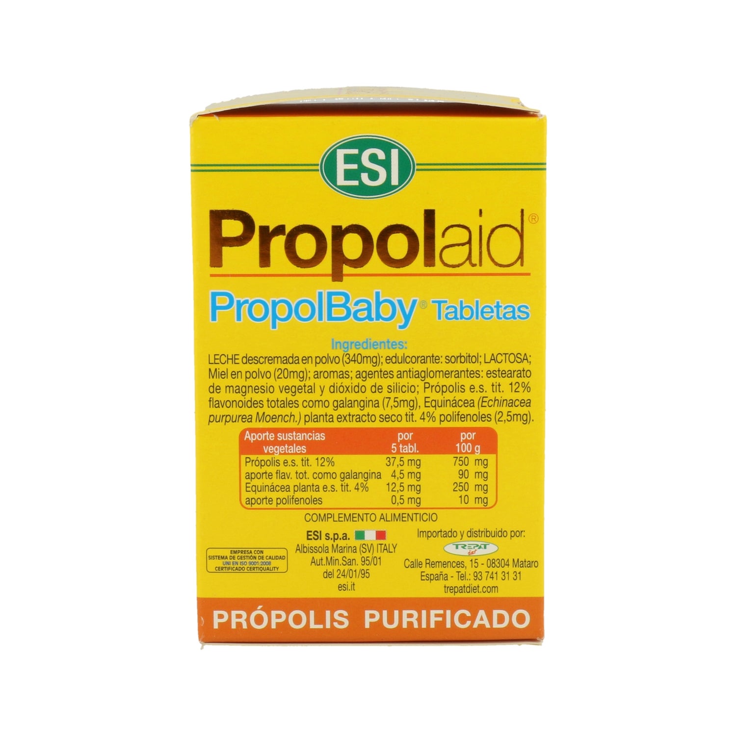 Lait écrémé en poudre (340 mg) ; édulcorant : sorbitol ; lactose ; poudre de miel (20 mg) ; arômes ; agents anti-agglomérants : stéarate de magnésium végétal et dioxyde de silicium ; propolis e.s.tit. 12 % de flavonoïdes totaux comme la galangine (7,5 mg), l'échinacée (Echinacea purpurea), extrait sec d'herbe titré, 4% de polyphénols (2,5 mg).