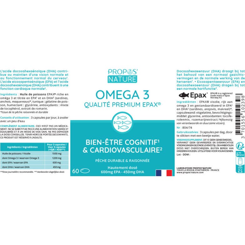 Propos' Nature Omega 3 Epax Origine Marine 60caps est un complément alimentaire de haute pureté, conçu pour le soin cardiovasculaire. Ce produit est spécialement indiqué pour ceux qui souhaitent maintenir une fonction cardiaque saine et protéger leur bien-être général.