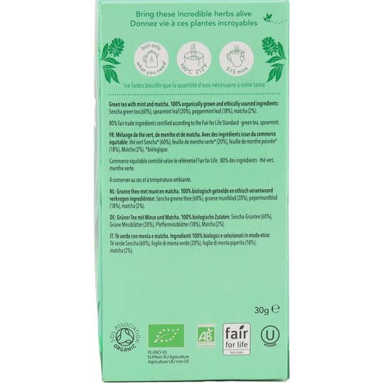 Ce thé vert biologique se distingue par son goût mentholé. La combinaison de thé vert et de menthe, avec l'ajout de matcha, procure une touche spéciale qui revitalise de manière délicieuse. Tous les ingrédients sont issus de cultures biologiques, contribuant à un mode de vie plus sain.