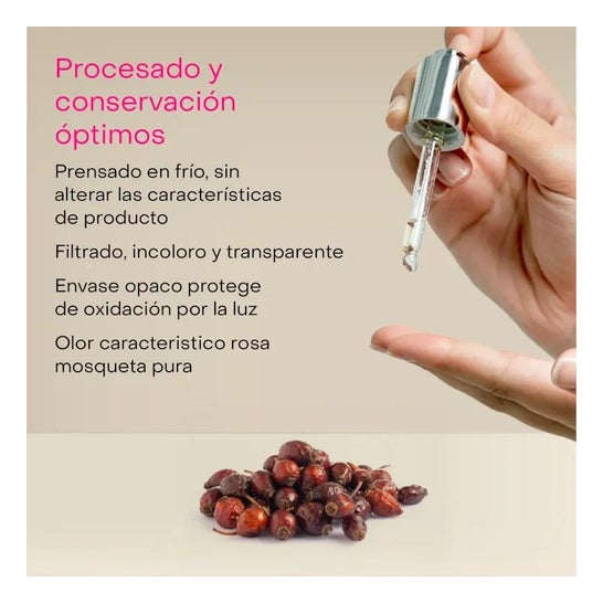 Huile de rose musquée (R. Rubiginosa) 100% naturelle. Convient à tous les types de peau, même les peaux sensibles, car il minimise le risque d'allergie.