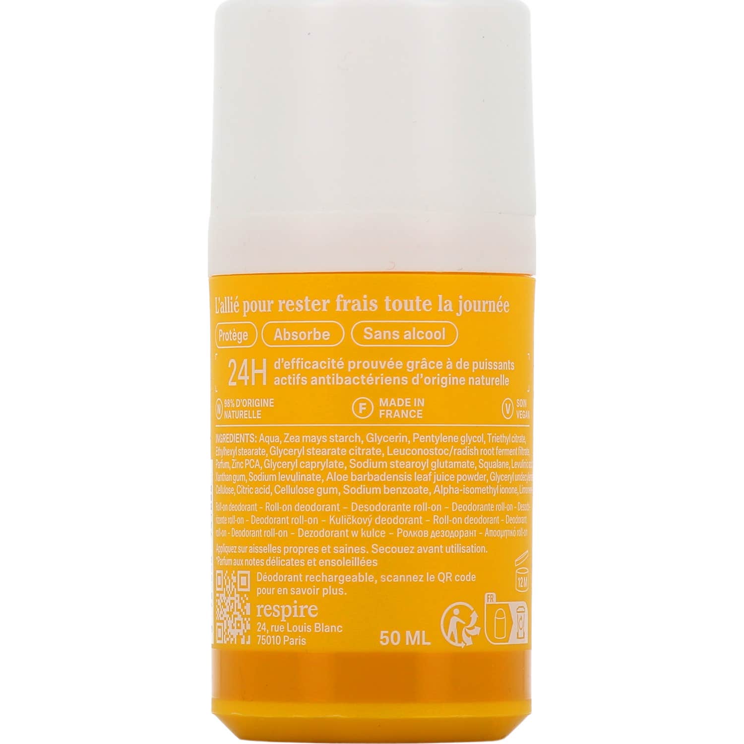 Respire Déodorant Roll-On Doux Monoï respecte les mécanismes naturels de transpiration. Sa formule contient des actifs antibactériens qui limitent la croissance des bactéries responsables de la formation d'odeurs désagréables. Parmi ses ingrédients, on trouve :