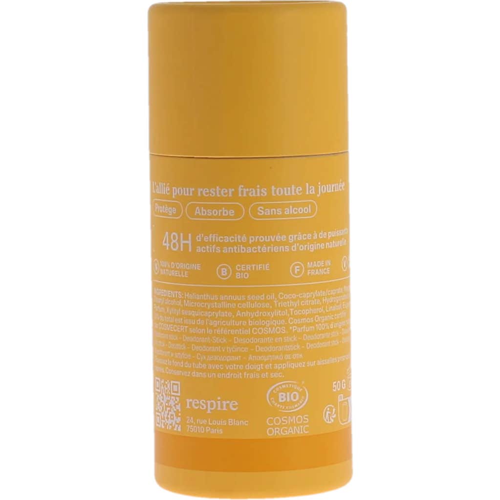 Respire Déodorant Stick Doux Monoï Efficacité 48H 50 g est un déodorant formulé pour offrir une protection efficace contre les odeurs et l'humidité pendant 48 heures. Sa composition est 100% d'origine naturelle et se distingue par son agréable fragrance de monoï, évoquant un parfum ensoleillé.