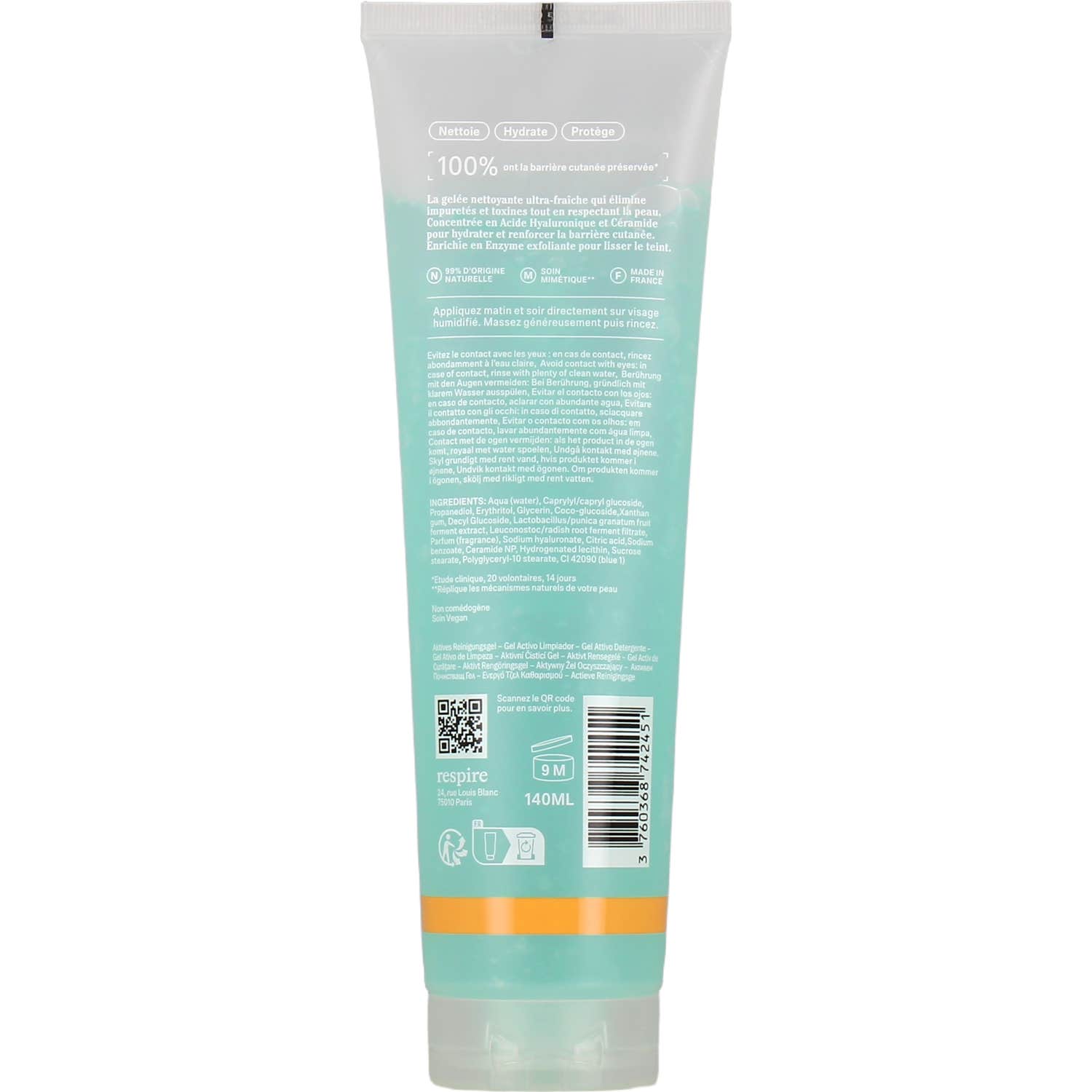 Respire Gel Active Nettoyant 150 ml est un nettoyant en gel frais et ultra efficace conçu pour éliminer les impuretés et les toxines sans compromettre la peau. Ce produit se distingue par sa teneur en acide hyaluronique et céramides, qui apportent hydratation et aident à renforcer la barrière cutanée.