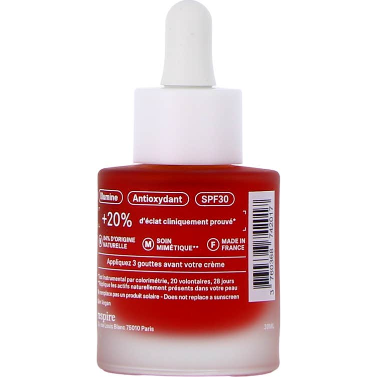 Respire Sérum Glow & Protect 30 ml est un sérum innovant à double action qui combine vitamine C encapsulée pour illuminer la peau et la protéger des agressions extérieures. Ce produit offre non seulement un effet immédiat de bonne mine, mais également une protection durable grâce à son action antioxydante et son indice de protection solaire SPF 30. C'est une excellente option pour maintenir l'éclat du teint et revitaliser la couleur sans recourir à des effets autobronzants.