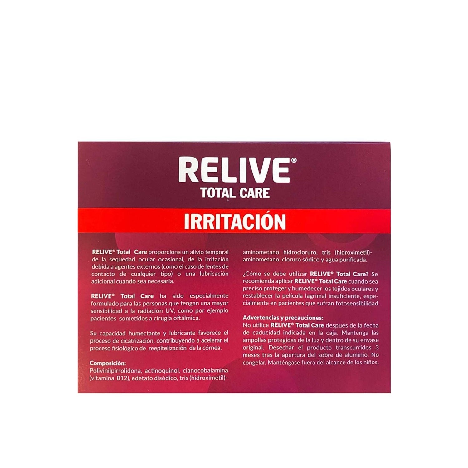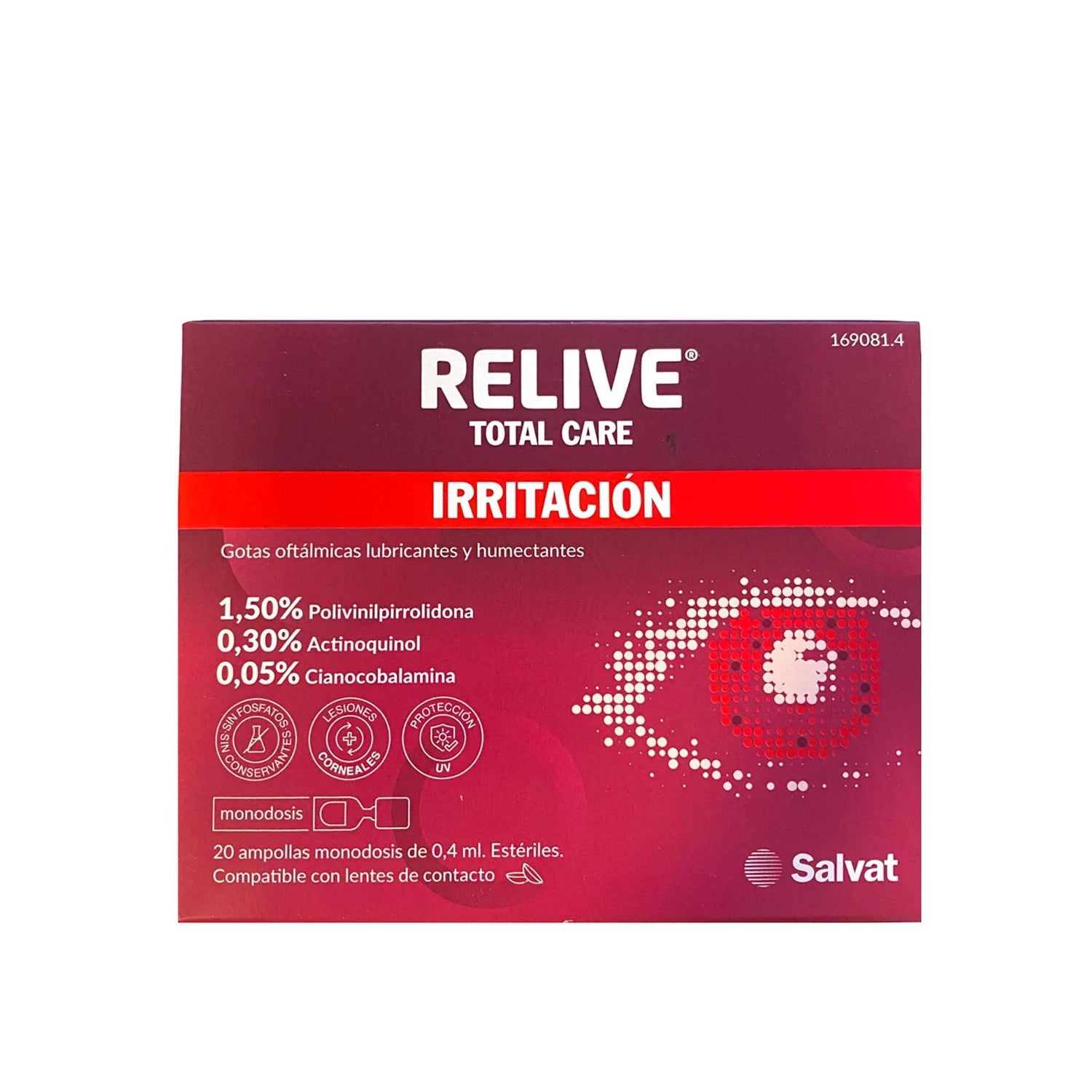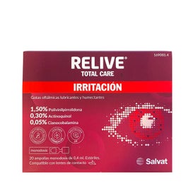 Gouttes oculaires Relive Total Care 20 gouttes oculaires en dose unique sont une goutte pratique, lubrifiante et hydratante pour la récupération des yeux après la période post-chirurgicale. Grâce à leur action lubrifiante intense, ils favorisent la réduction de la sécheresse oculaire occasionnelle et de l'irritation causée par les agents extérieurs. Ce liquide stérile contient du polyvinylpyrrolidone, un composé qui augmente le temps de rétention d'eau à la surface de l'œil et apaise toute gêne ou démangeaison. Il présente une couleur rougeâtre due à la présence de cyanocobalamine, sans qu'il soit nécessaire de tacher vos lentilles ou de pigmenter vos larmes.