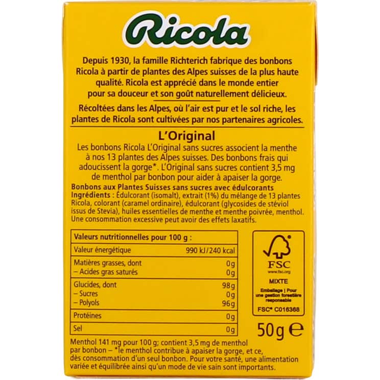 Les bonbons Ricola L'Original sont les premières pastilles que la marque a lancées, contribuant de manière significative à sa popularité. Ces pastilles offrent non seulement un goût rafraîchissant, mais procurent également une sensation de confort similaire à celle de déguster une tasse de thé chaud. Elles contiennent un mélange d'ingrédients naturels tels que :
