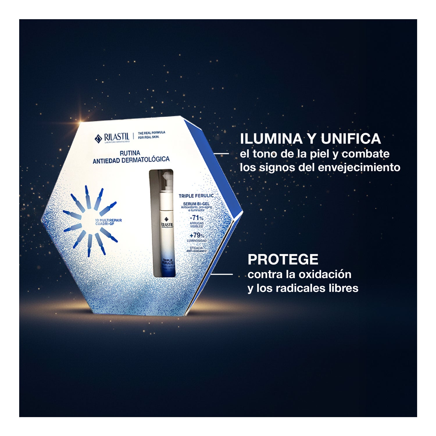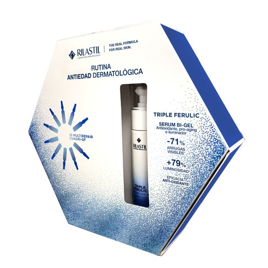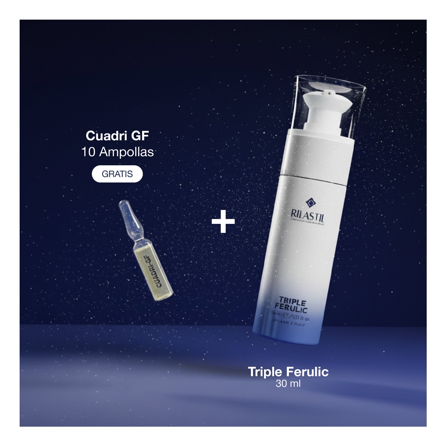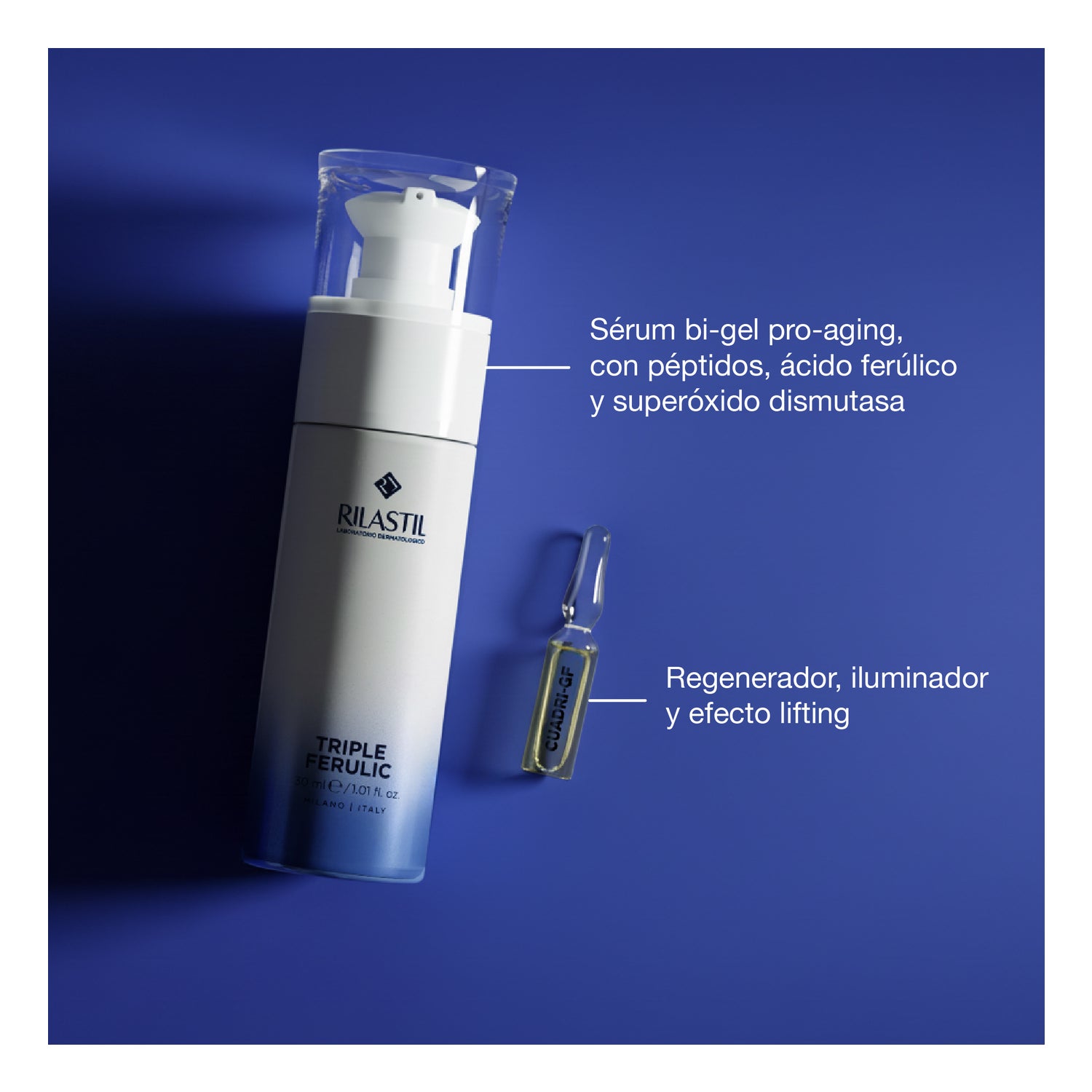 Triple Ferulic : Sérum bi-gel anti-âge avec peptides, acide férulique et superoxyde dismutase. ILLUMINE ET UNIFIE le teint de la peau, COMBAT LES SIGNES DU VIEILLISSEMENT, réduisant les rides et les lignes d'expression et PROTÈGE CONTRE L'OXYDATION ET LES RADICAUX LIBRES, prévenant l'oxydation de la peau et le vieillissement prématuré de la peau. Il est adapté à tous les types de peau.