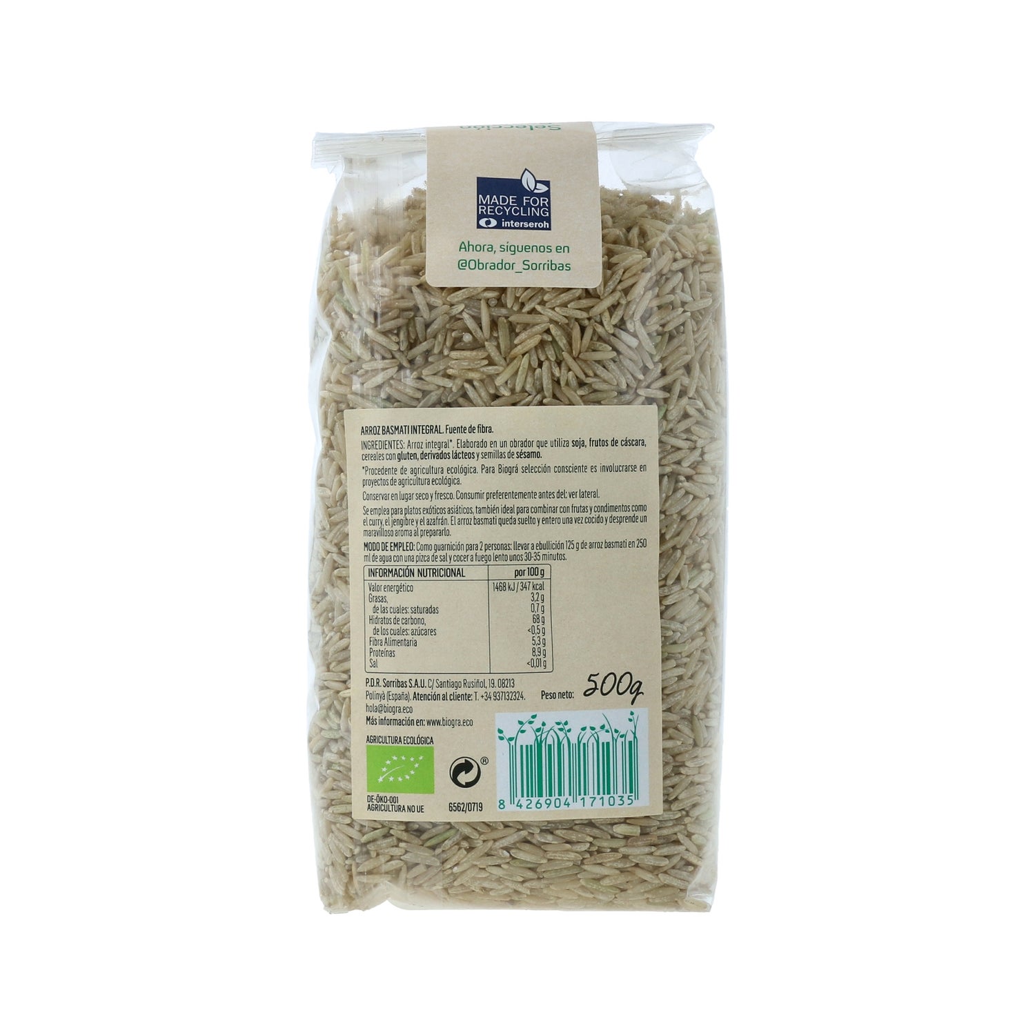 Riz basmati brun, en format 500g. Riz à grain long d'une grande consistance. Il contient des protéines et des minéraux tels que le manganèse pour activer le métabolisme des protéines et des glucides. Avec du fer, du sélénium, du calcium, du potassium et du cuivre. Ne contient ni gras ni sodium. Contient des vitamines B telles que B1, B3, B6, B2, B5, B8 et B9. Fournit des antioxydants grâce à sa teneur en vitamine E, contient également de la vitamine K qui apporte des nutriments au sang. Convient à une consommation quotidienne.