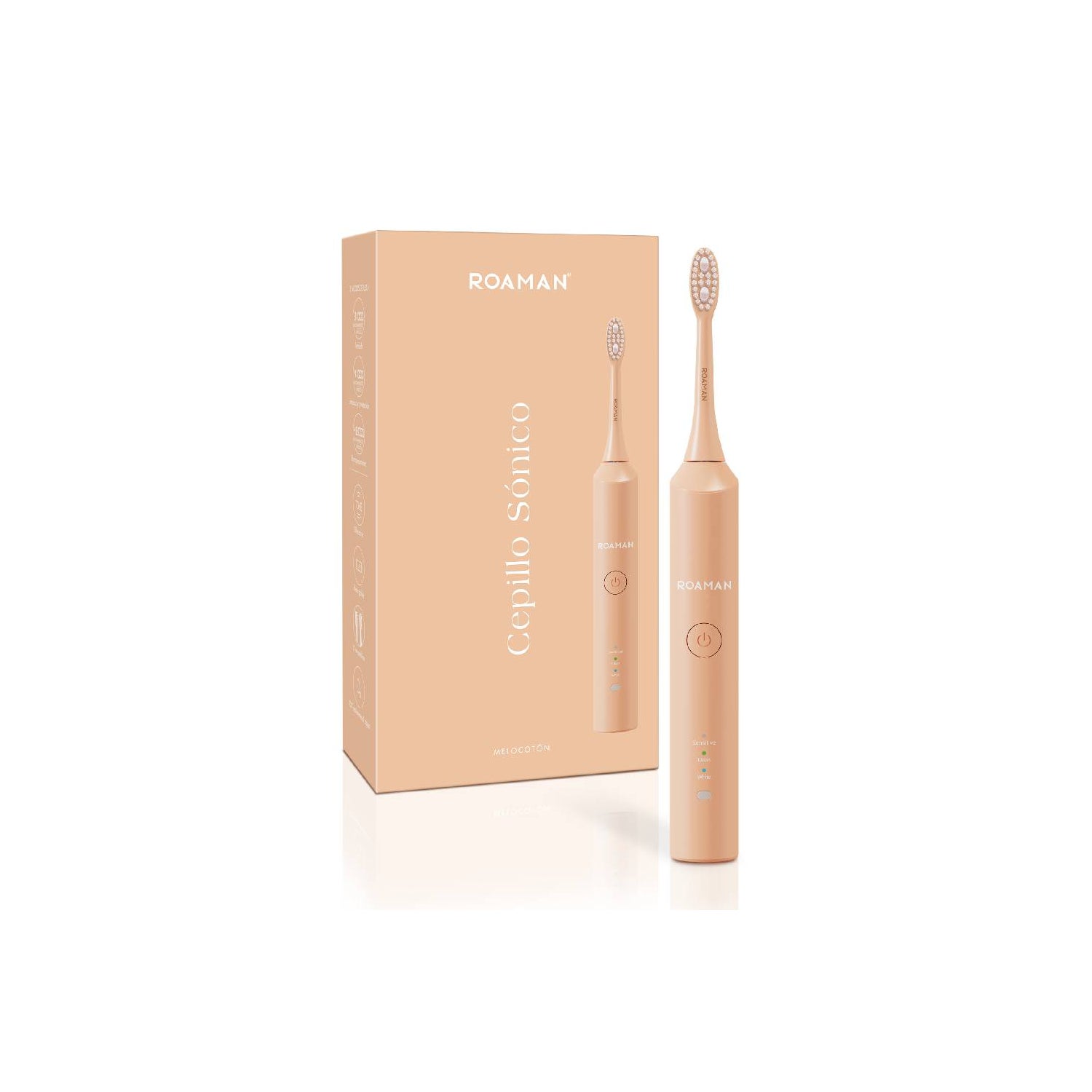 Roaman T3S Melo Brosse Soniques Pêche 1 ud est une brosse à dents électrique avec technologie sonique, conçue pour un nettoyage buccal en profondeur lors d'une utilisation quotidienne. Elle présente un design ergonomique en couleur pêche et une résistance à l'eau IPX7, adaptée également pour les voyages.