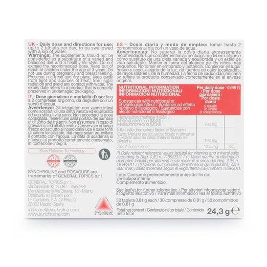 Complément alimentaire à base de méthylsulfonylméthane, d'extrait sec de chardon marie et de zinc qui contribue au maintien d'un état cutané normal. Le chardon marie est un protecteur naturel du foie qui stimule l'effet détoxifiant des cellules hépatiques. Il possède des propriétés anti-inflammatoires, anti-allergiques, antioxydantes et astringentes.