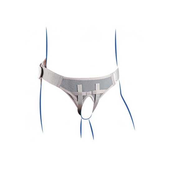 Sac scrotal adaptable au treillis Orliman BS-110. Il convient pour contenir la zone, soulager la douleur, réduire l'inconfort des hernies scrotales ou comme traitement post-opératoire. Elle est achetée séparément de la ceinture orthopédique. Il est conçu par taille et comporte des trous dans les niveaux pour l'ajuster à la hauteur souhaitée. Ce sac est interchangeable et existe jusqu'à 7 tailles en fonction des besoins de chaque patient.