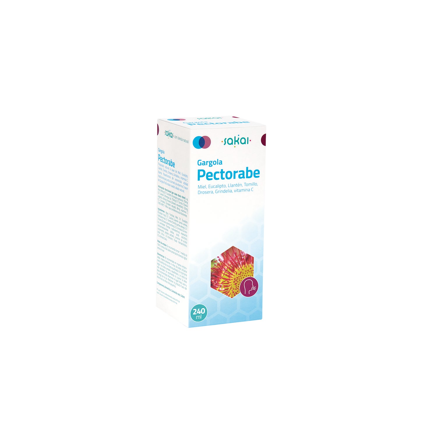 Sakai Gargola Pectorabe 240ml est un complément alimentaire à base d'eucalyptus, de plantain, de thym, de rossolis et de grindelia, de vitamine C et de miel. Il convient aux personnes qui ont besoin d'une action apaisante sur les voies respiratoires.