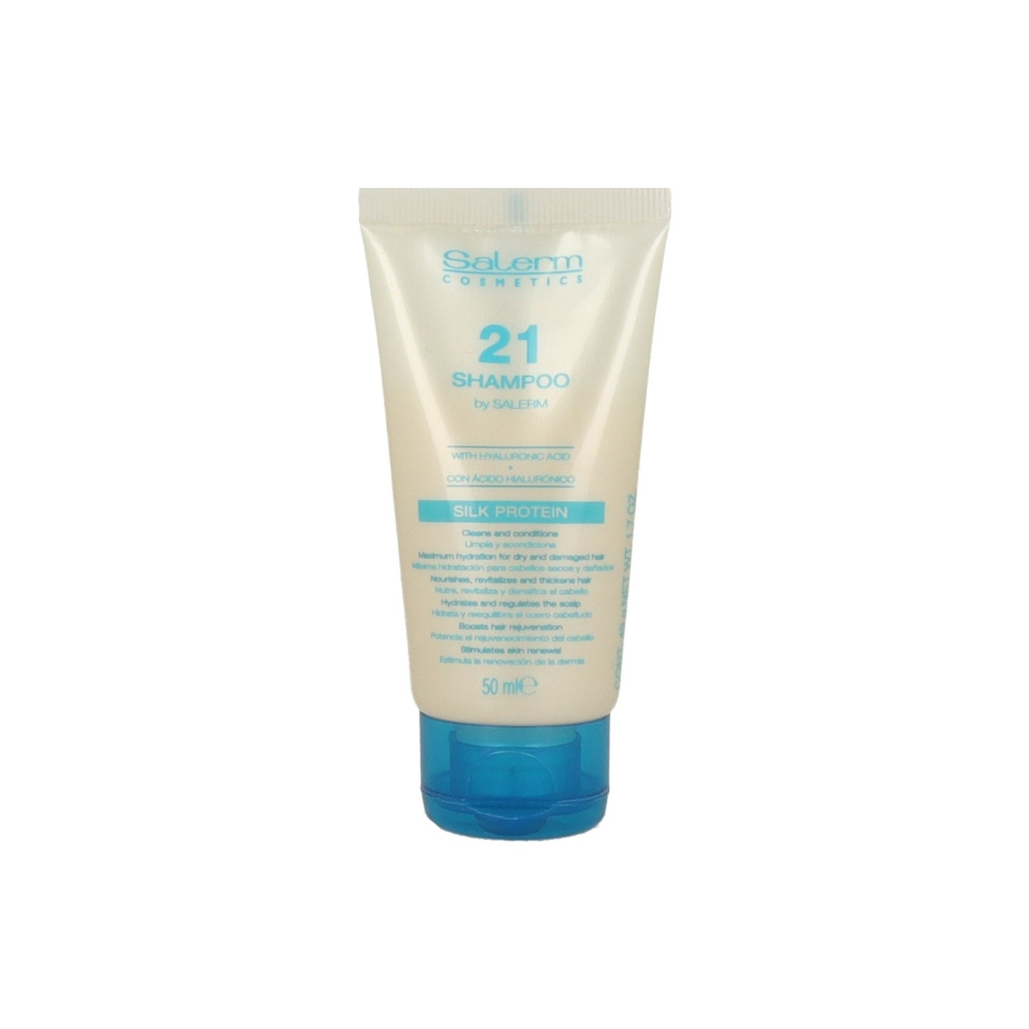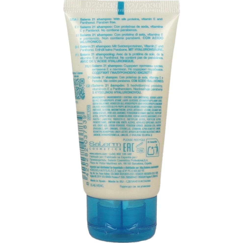 Salerm 21 Shampoo Protéine de Soie 50 ml pour cheveux secs et abîmés est un shampooing conditionneur qui nettoie en douceur et aide à réparer en profondeur. Sa formule avec protéines de soie agit sur la fibre capillaire et apporte hydratation et nutrition dès la première application.