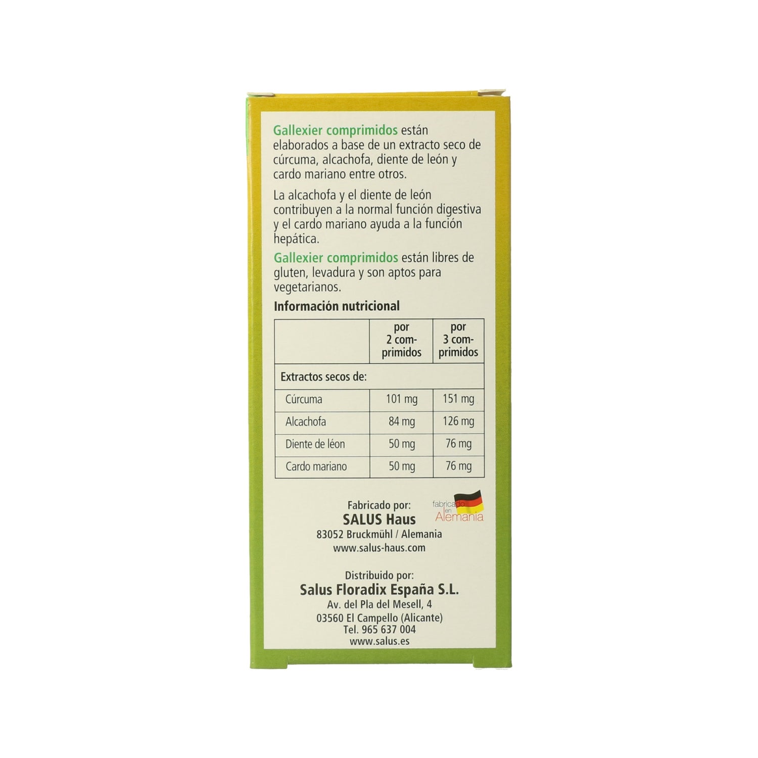 La formule àbase de plantesSalus Floradix Gallexier® estun complément alimentaire composé d'extraits secs de curcuma, d'artichaut, de pissenlit et de chardon-marie, entre autres, qui aide à favoriser la digestion des repas lourds.