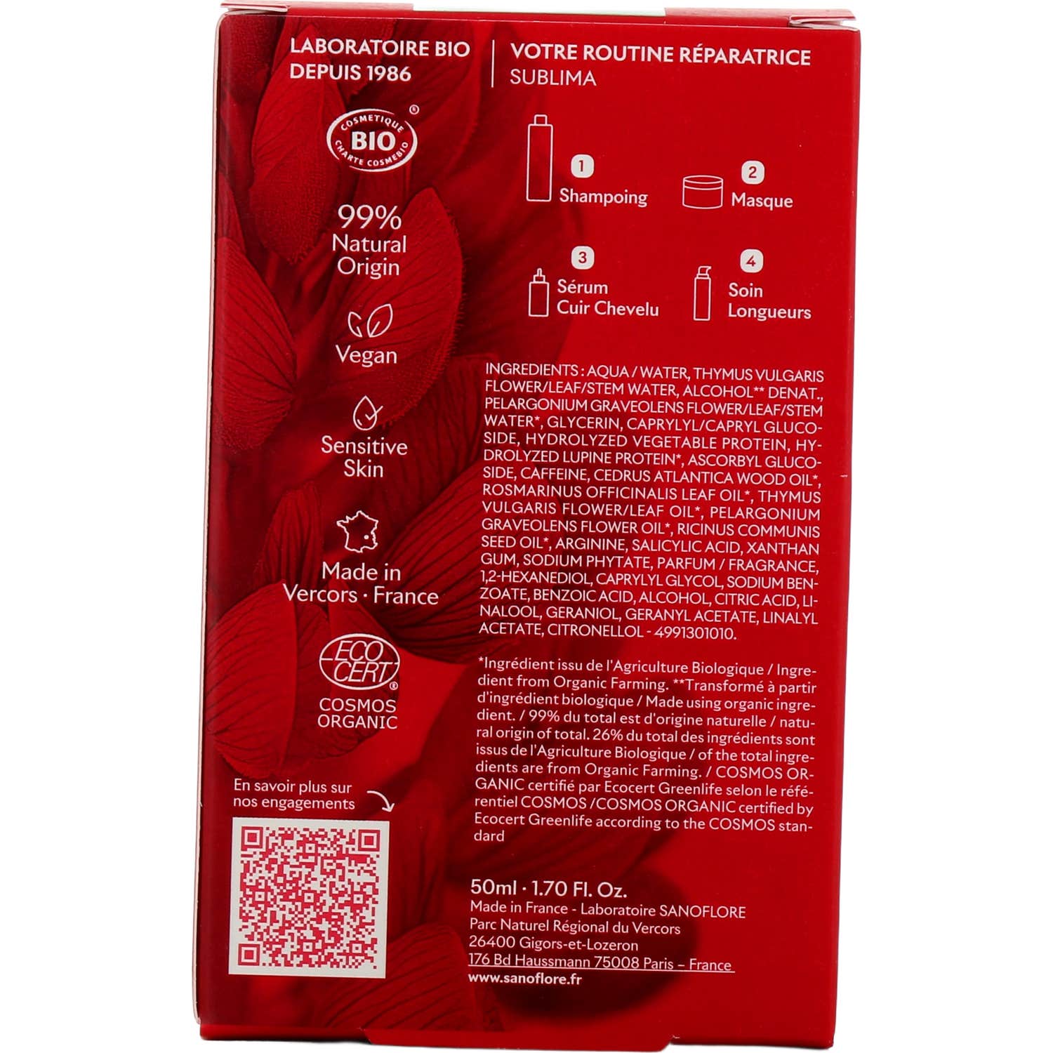 Sanoflore Sublima Sérum Cuir Chevelu Bio est un traitement conçu pour renforcer les cheveux depuis la racine. Sa formule repose sur un complexe breveté qui combine :