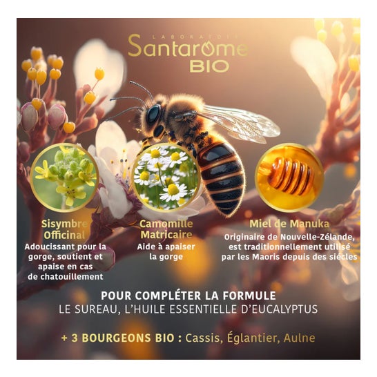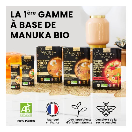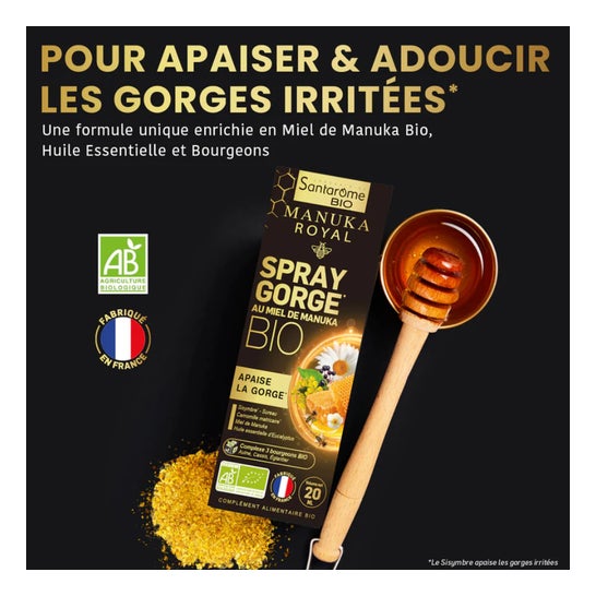 Santarome Manuka Royal Spray Gorge Bio 20ml associe les bienfaits de la phyto, de la ruche, de l’aromathérapie et de la gemmothérapie pour apaiser les gorges irritées et favoriser le confort respiratoire.