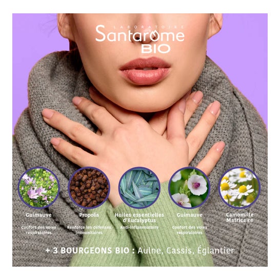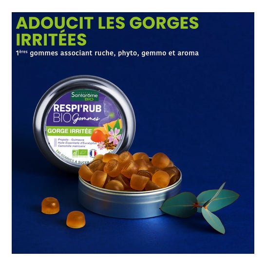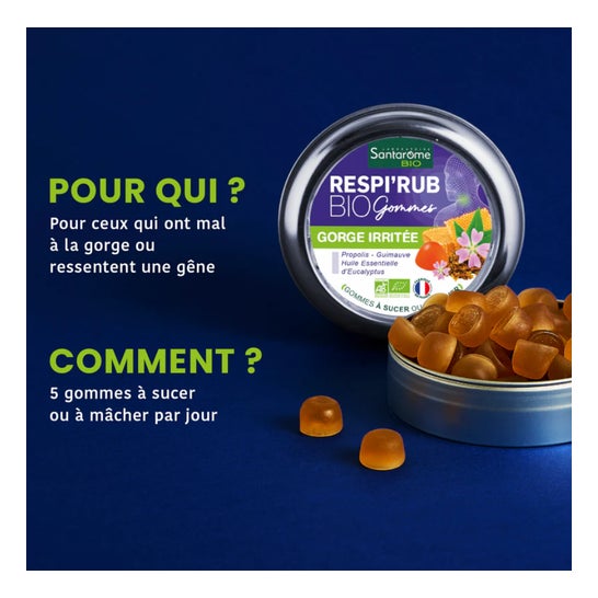 Santarome Respi'Rub Bio Gommes Gorge Irritée 45 Gommes sont conçues pour apaiser la gorge et faciliter la respiration en période de refroidissement.