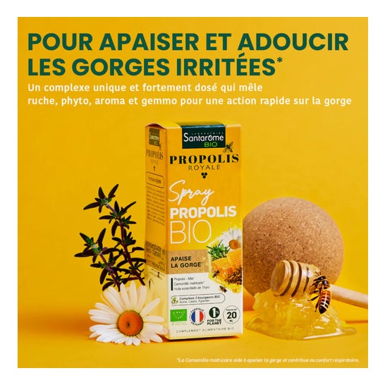 Santarome Spray Propolis Royale Bio 20ml est une formule exclusive qui associe des ingrédients biologiques soigneusement sélectionnés :