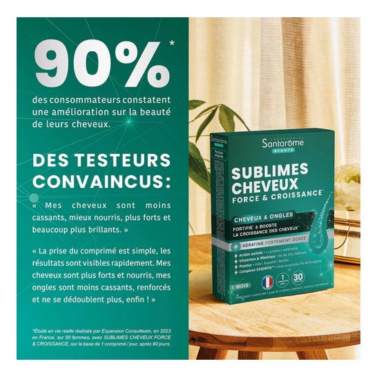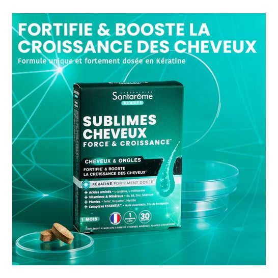 Santarome Sublimes Cheveux Force et Croissance 30 Comprimés est un complément alimentaire conçu pour soutenir la croissance capillaire et renforcer la fibre dès la racine.