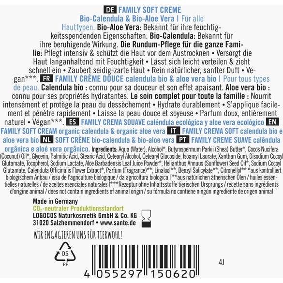 Sante Family Crème Douce Bio Calendula & Aloe 150 ml est une crème ultra-nourrissante qui s'absorbe facilement dans la peau. Sa formulation est conçue pour nourrir intensément, protégeant la barrière hydrolipidique du visage. Ce produit est adapté tant pour le visage que pour le corps, laissant la peau avec une sensation de douceur et de soyeux. Il convient à tous les types de peau.