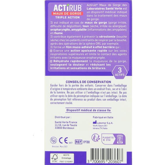 Sante Verte Actirub Douleur de Gorge Triple Action 20comp est un produit conçu pour fournir un relief efficace face à la douleur de gorge, à la toux et à l'inflammation des voies respiratoires. Sa formule à triple action agit rapidement, soulageant les inconforts dans les voies respiratoires supérieures.