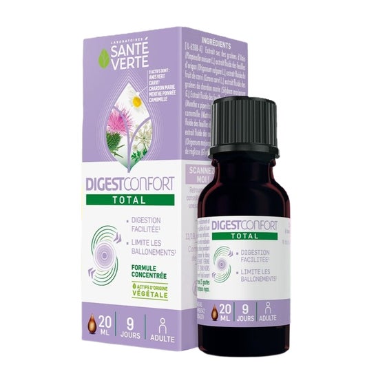 Santé Verte DigestConfort Total 20ml est un complément alimentaire à base d'un mélange de plantes destiné à favoriser le bien-être digestif. Il contient un complexe de neuf plantes spécifiques, dont le carvi, reconnu traditionnellement pour favoriser la digestion, aider à soulager les inconforts digestifs tels que les ballonnements et favoriser un bon transit intestinal. Réservé aux adultes. Les compléments alimentaires doivent être utilisés dans le cadre d'une alimentation variée et équilibrée et d'un mode de vie sain.