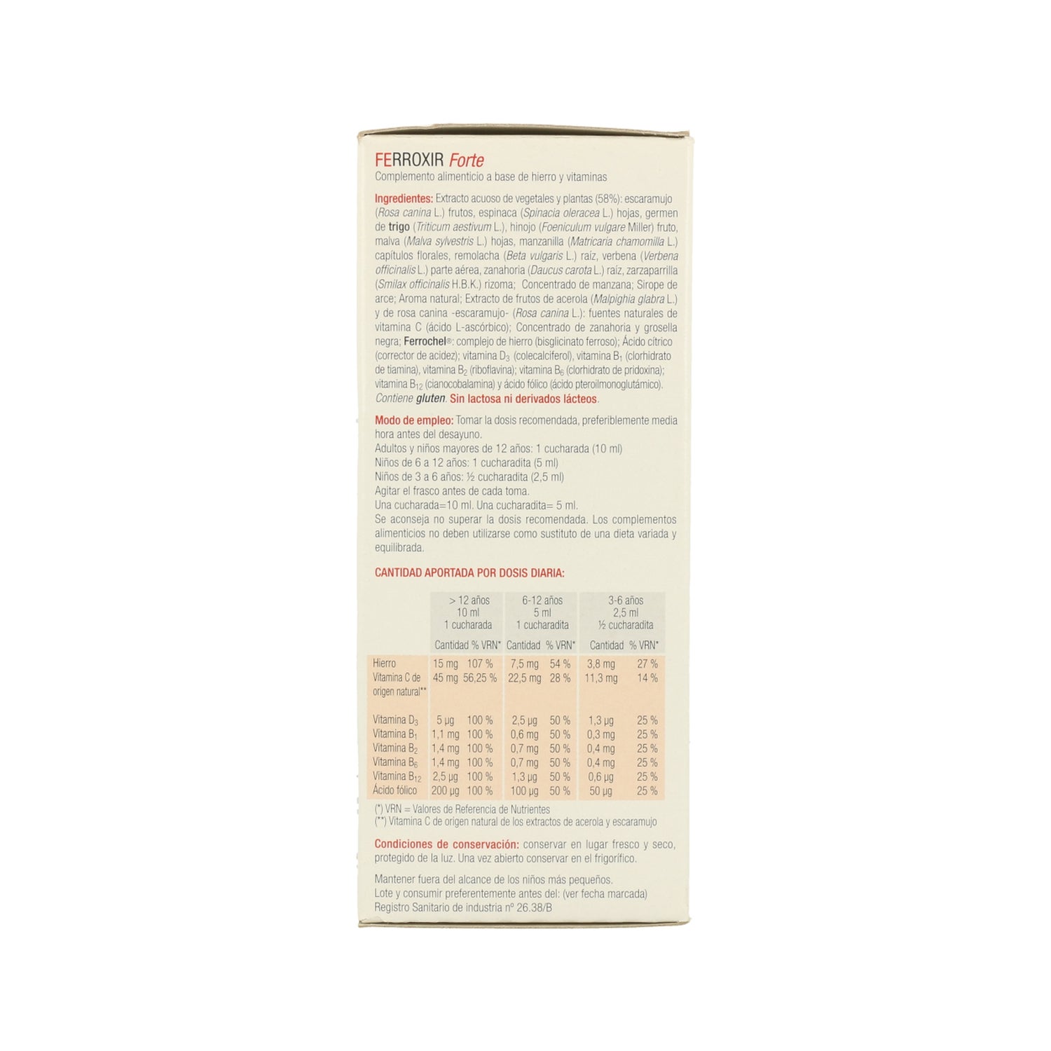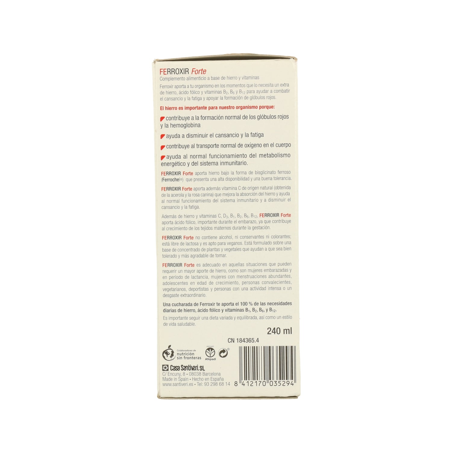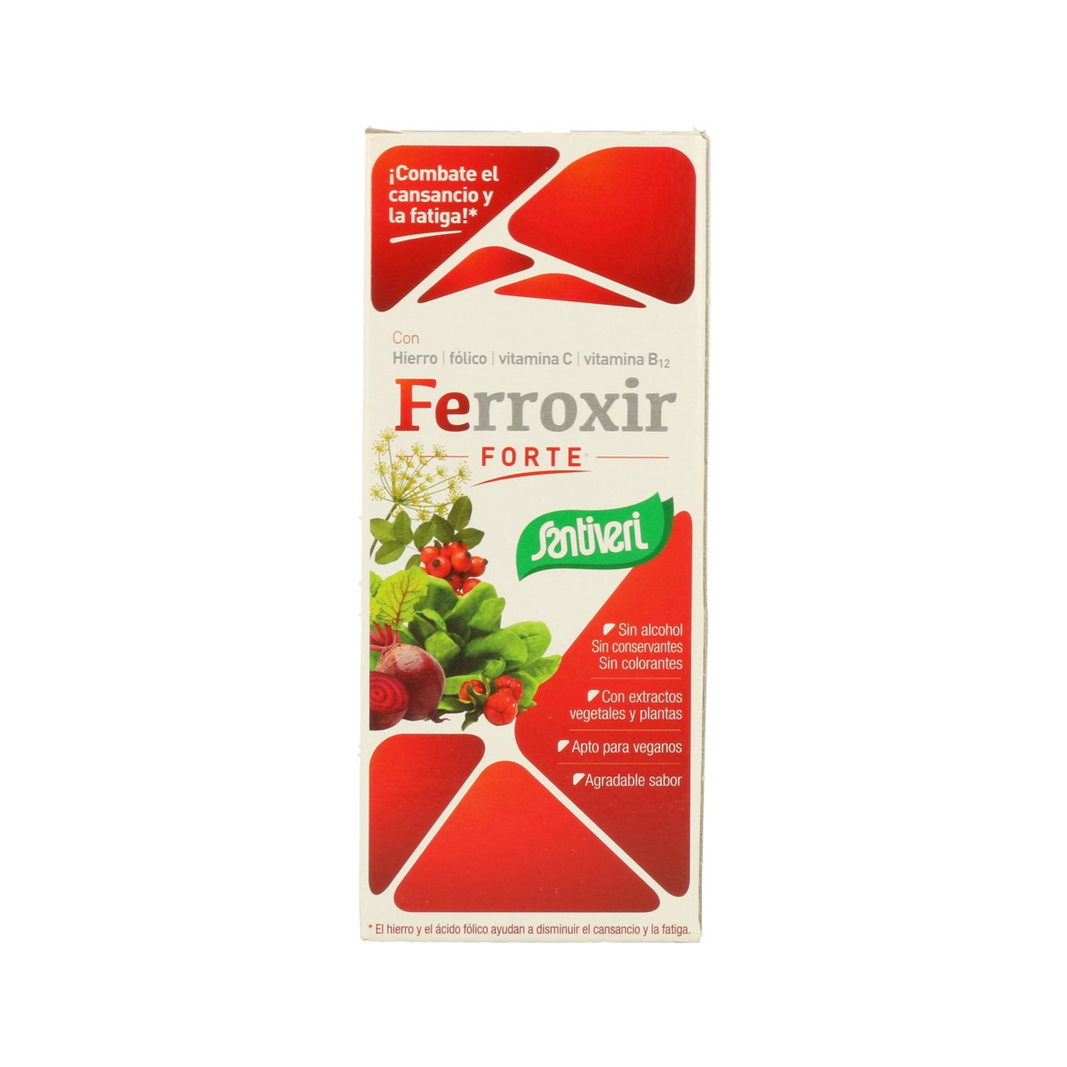Santiveri Ferroxir Forte 240ml est un sirop qui constitue un complément alimentaire spécialement conçu pour lutter contre la sensation de fatigue et d'épuisement. Sa composition comprend du fer, de l'acide folique et des vitamines B2, B6 et B12 qui apportent à l'organisme une dose supplémentaire de vitalité et d'énergie. Il est également enrichi en vitamine C, qui renforce le système immunitaire et facilite l'absorption du fer. Fabriqué à partir d'ingrédients naturels tels que des fruits, des légumes et des plantes, ce produit est une source précieuse de nutriments essentiels pour notre santé. Grâce au sirop Ferroxir Forte de Santiveri, vous pouvez profiter de ses bienfaits pour vous sentir actif et plein d'énergie dès l'âge de 3 ans. Il est recommandé de ne pas dépasser la dose journalière recommandée et de garder à l'esprit que les compléments alimentaires ne se substituent pas à une alimentation saine et équilibrée.