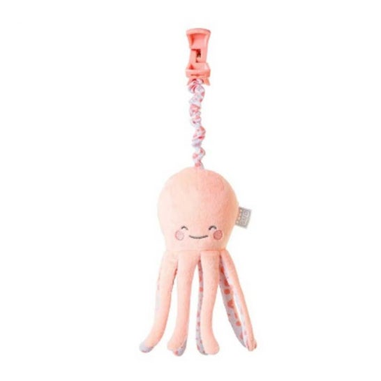 Hochet fabriqué en tissu avec un grelot à l'intérieur, conçu pour le jeu et la stimulation des bébés. Il a huit pattes et une tête moelleuse, et est doté d'un ruban avec un crochet pour être fixé au berceau. L'utilisation du jouet stimule l'imagination des enfants, ce qui le rend idéal pour le processus d'apprentissage des tout-petits. Couleur rose.