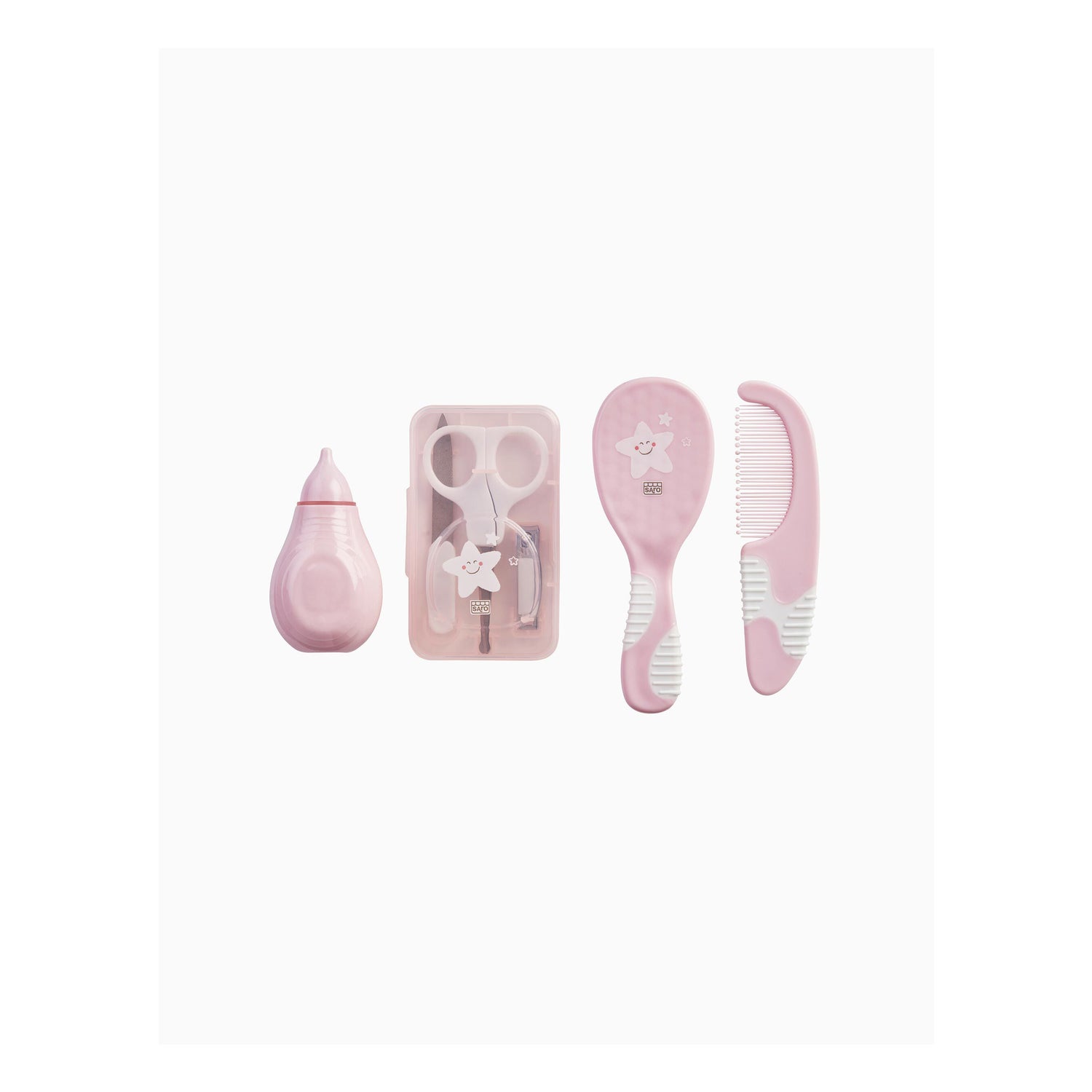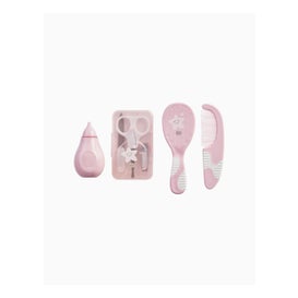 Set de 7 accessoires spécialement conçus pour le soin et l'hygiène des tout-petits. Contient un flacon compte-gouttes, un aspirateur nasal, un peigne, une brosse en poils naturels, des ciseaux pratiques, un coupe-ongles et quatre limes à ongles. Comprend un sac organisateur à emporter partout, avec un tissu rose imperméable. Il s'agit de produits durables fabriqués à partir de matériaux résistants.