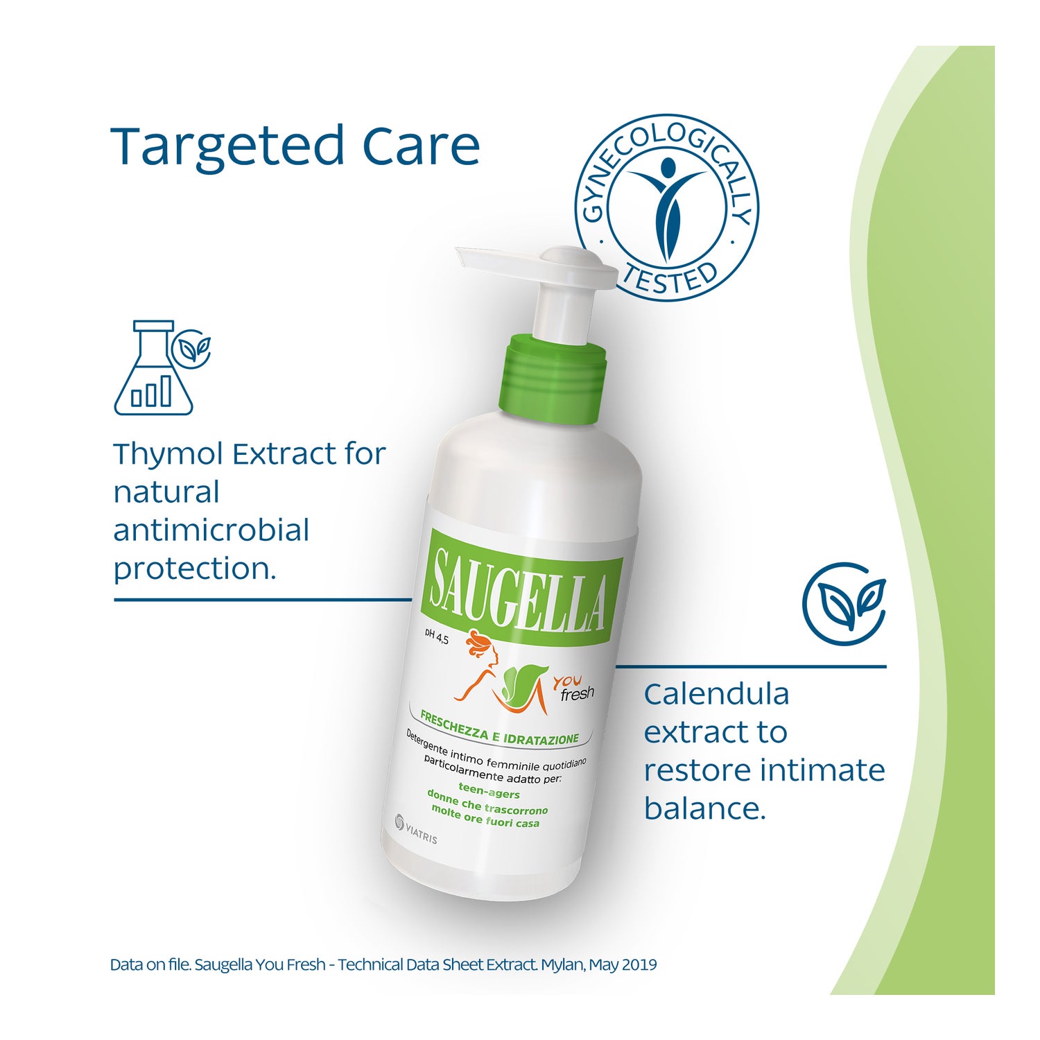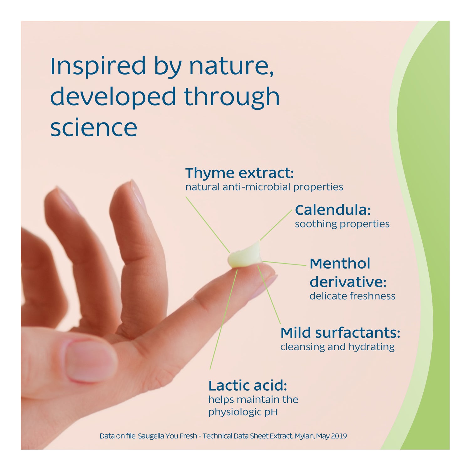 Saugella You Fresh gel intime 200ml est un gel d'hygiène intime avec action rafraîchissante élaboré à base de Thymus Vulgaris et Calendula Officinalis. Il est destiné à l'hygiène intime quotidienne de chaque femme grâce à l'utilisation de tensioactifs doux et d'origine naturelle.