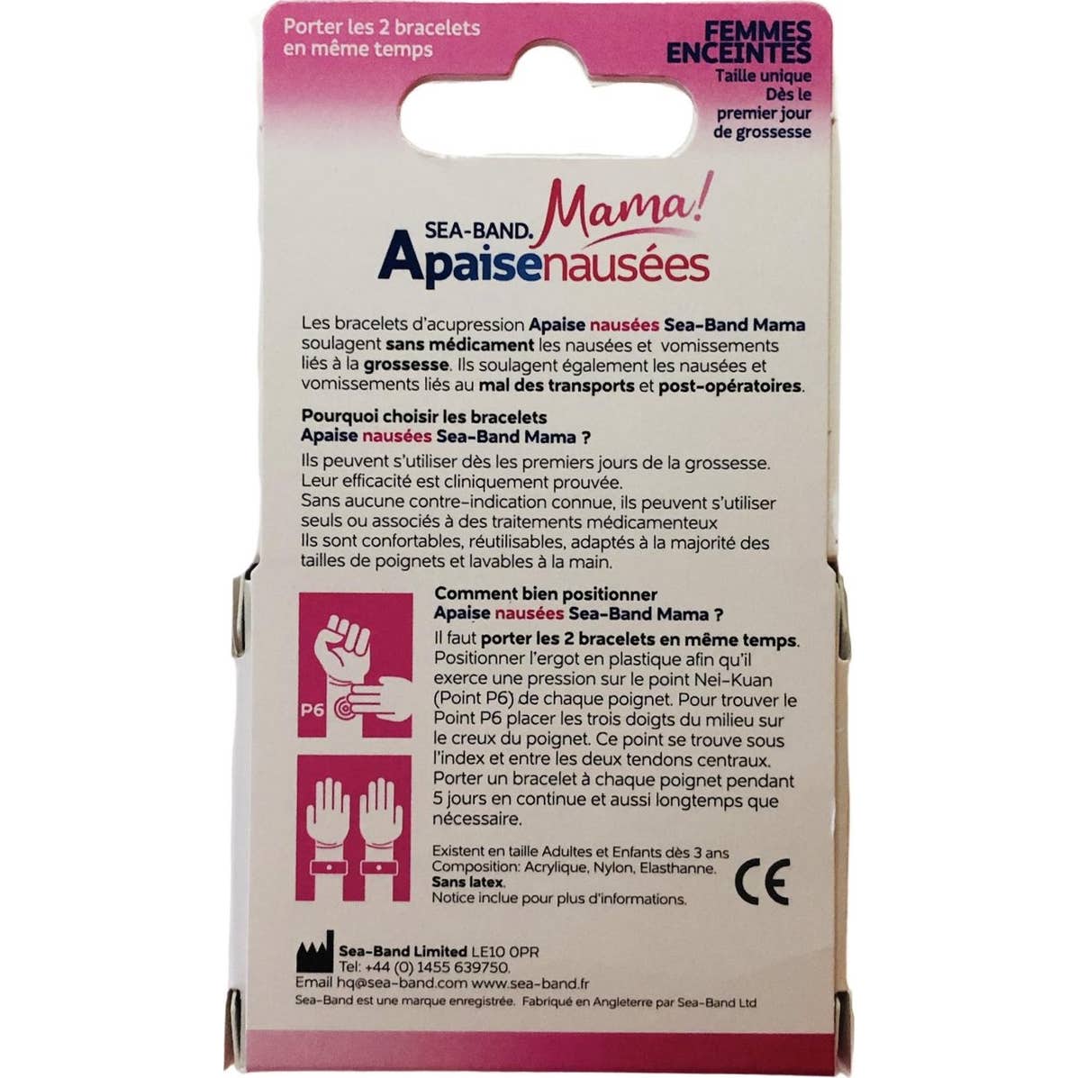 Sea Band Mama Bracelet Calming Nausea Pink 2pcs est un produit conçu pour offrir un soulagement des nausées grâce à l'utilisation de l'acupression. Cette technique, d'origine chinoise, repose sur l'application d'une pression continue sur le point P6, également connu sous le nom de Nei-Kuan, situé sur chaque poignet.