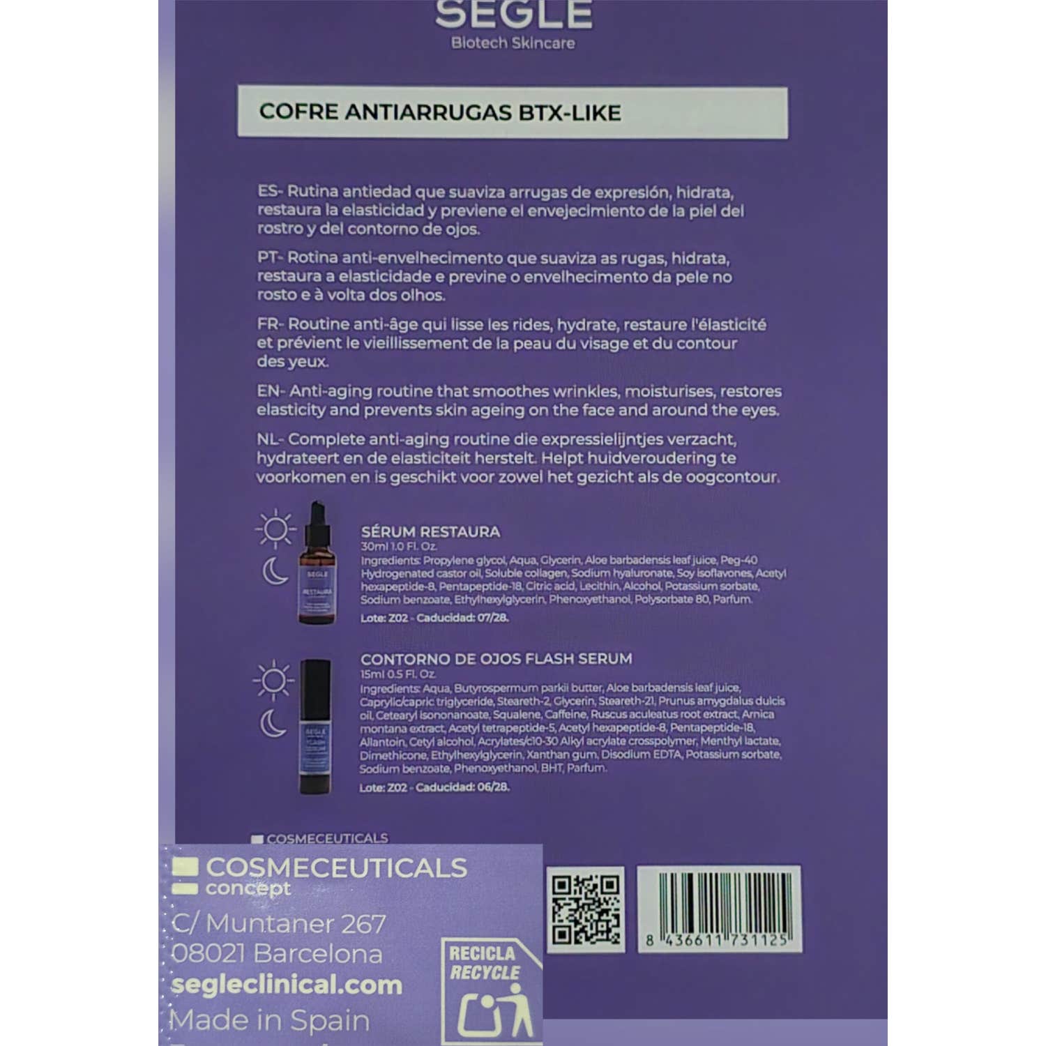 Segle Clinical Pack Coffret Anti-rides Btx-Like est un traitement conçu pour adoucir et prévenir les rides d'expression, tout en apportant hydratation et élasticité à la peau. Ce pack comprend deux produits essentiels qui agissent en synergie pour prendre soin de la peau de manière efficace.