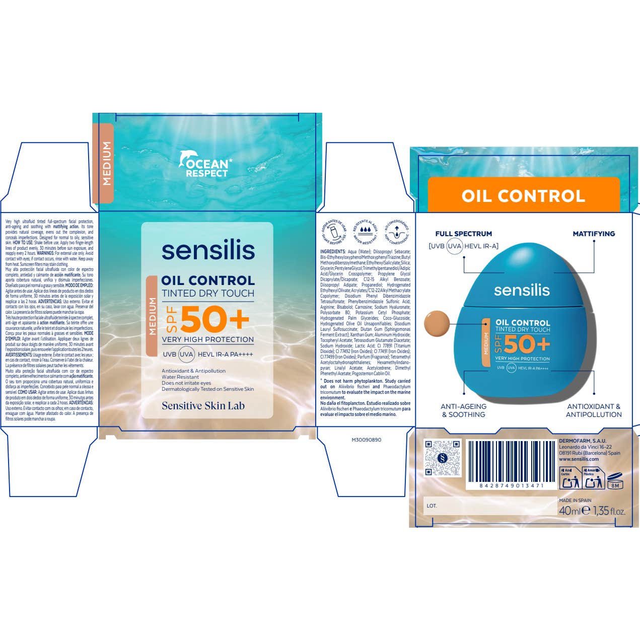 Photoprotecteur facial teinté ultraléger à texture dry touch, qui protège contre tout le spectre de rayonnement solaire (UVA, UVB, HEV et IR-A) et aide à contrôler l'excès de sébum, offrant un fini mat durable.