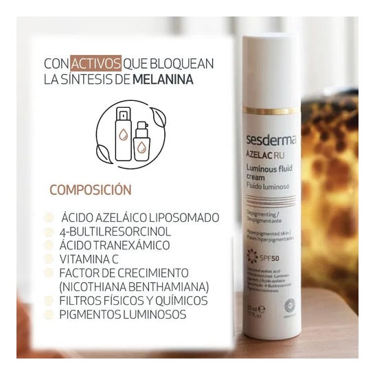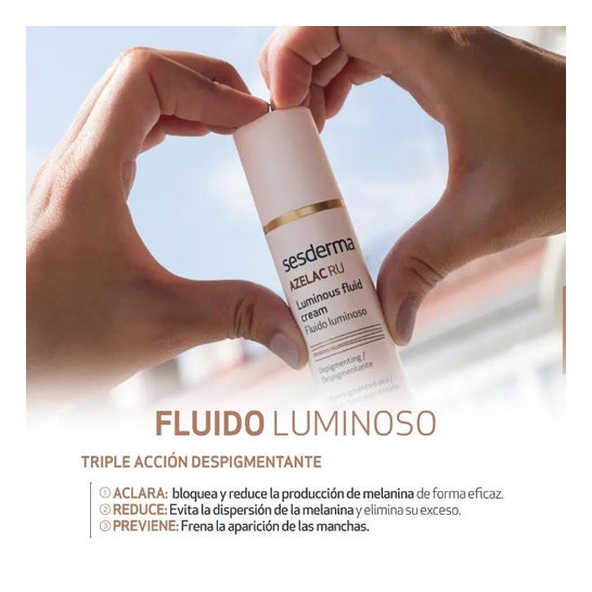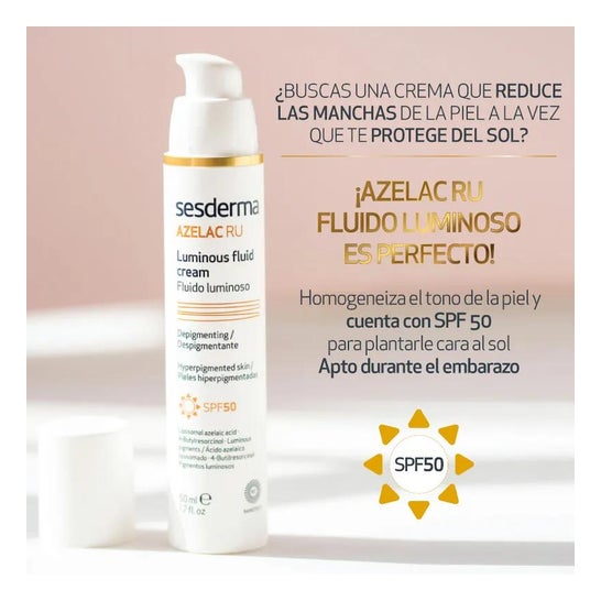 Sesderma Azelac RU Fluide Lumineux SPF50 50ml est un fluide avec des actifs dépigmentants liposomés. Il aide à améliorer l'apparence des taches et unifier le teint de la peau. Il a un facteur de protection SPF50 et contient des filtres. Ses pigments lumineux aident à avoir une peau sans taches et avec un teint plus lumineux.