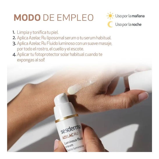 Appliquer Azelac Ru Fluide lumineux avec un doux massage sur tout le visage, le cou et le décolleté.