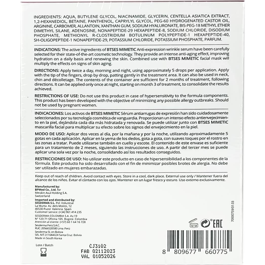 Sesderma Btses Mimetic Serum Anti-rides Expression B-Tox est un sérum conçu pour lutter contre les signes de l'âge. Sa formule intègre le système anti-âge exclusif B-TOX System+, qui comprend un polypeptide botulinique, un ingrédient clé pour la réduction des rides.