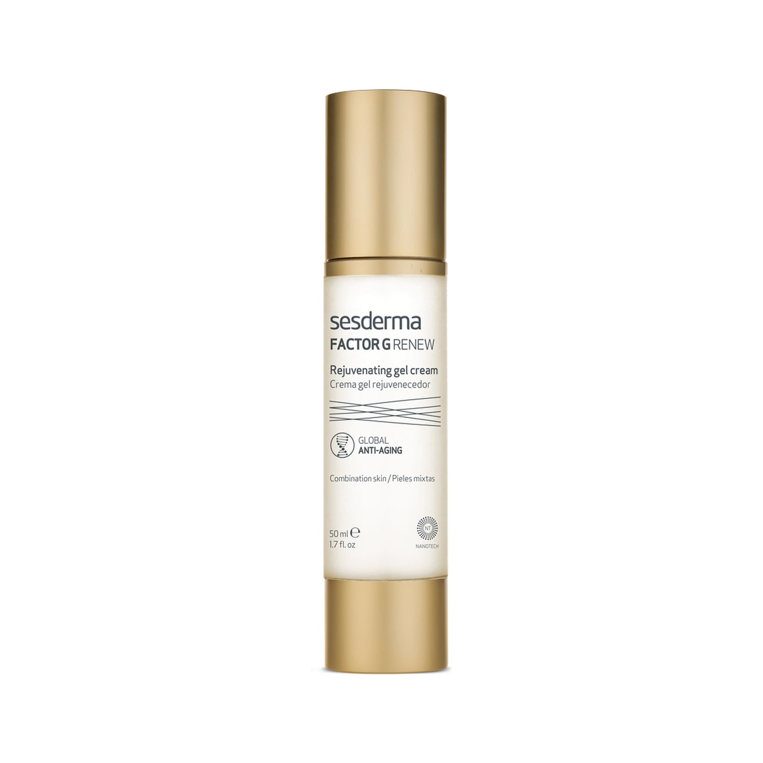 Crème gel pour le visage résultant de l'application de la biotechnologie aux soins et à la régénération de la peau. Il contient 7 facteurs de croissance d'origine biotechnologique végétale, qui activent les mécanismes de régénération de la peau pour multiplier par 3 la synthèse du collagène et de l'élastine et ainsi lutter contre la flaccidité et les rides. Une peau hydratée et plus élastique. Puissant concentré anti-âge aux facteurs de croissance et aux cellules souches végétales qui stimule la régénération cellulaire et la production de collagène et d'élastine (respectivement 181% et 147%). Améliore l'apparence de la peau. Réduction des rides. Une peau jeune et nouvelle : plus lisse, plus ferme et plus turgescente. Principes actifs encapsulés dans des liposomes pour une meilleure pénétration et efficacité.