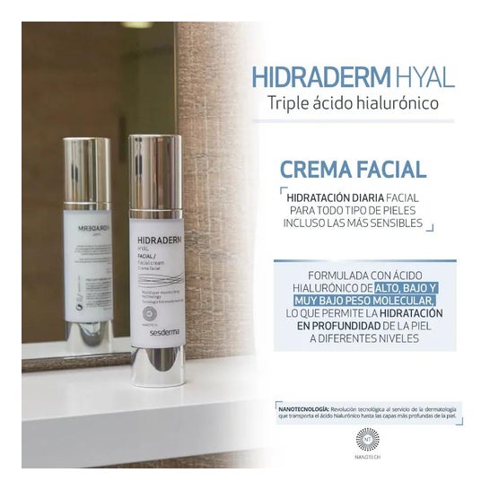 Cette crème aide à soulager la sécheresse causée par des facteurs externes (climat sec, froid, savon, etc.) ou des traitements esthétiques ou dermatologiques. De plus, grâce à sa formule à base d'acide hyaluronique de différents poids moléculaires, elle pénètre dans les différentes couches de la peau pour hydrater en profondeur et favoriser la rétention d'eau dans la peau.