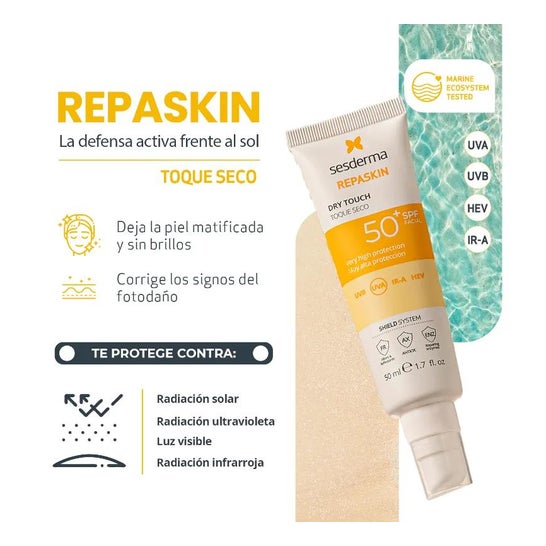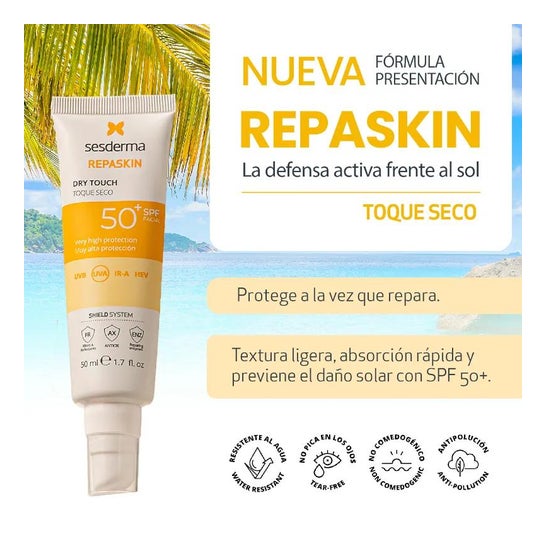 Sesderma Repaskin Photoprotecteur Facial Touch Sec SPF50+ 50ml est un photoprotecteur facial qui t'aidera à protéger la peau des radiations solaires, prévenant le photo-vieillissement.