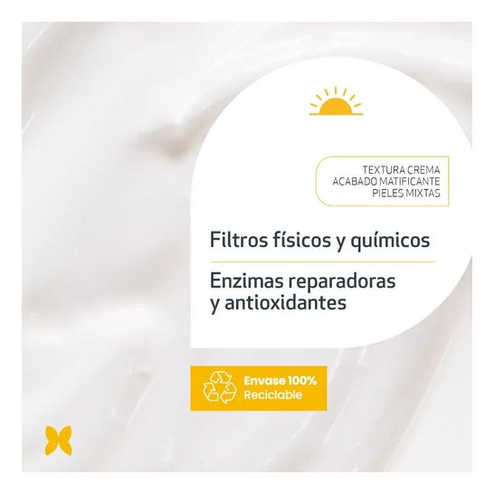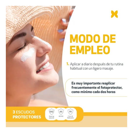 Sa formule avec filtres physiques et chimiques SPF50+ évite les brûlures et les érythèmes et répare jusqu'à 50 % des dommages photoniques accumulés. De plus, il possède une texture crémeuse avec un toucher sec.