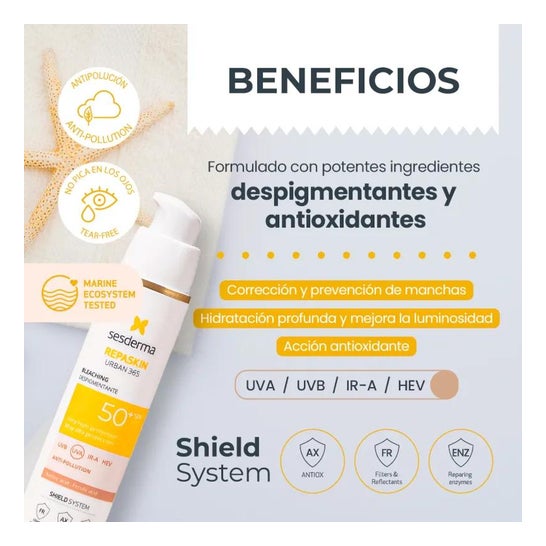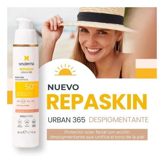 Sesderma Repaskin Urban 365 Despigmentant SPF50+ 50ml est un protecteur solaire dépigmentant qui aide à unifier le teint de la peau, prévient le photo-vieillissement cutané et répare les dommages cellulaires.
