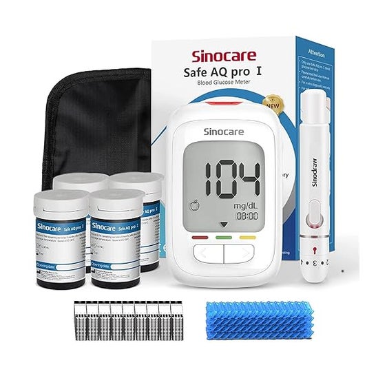 Sinocare Safe Aq Pro I Kit Glucomètre + 100 Bandes + Piqûre est un ensemble complet conçu pour la mesure de glucose dans le sang. Ce kit comprend :