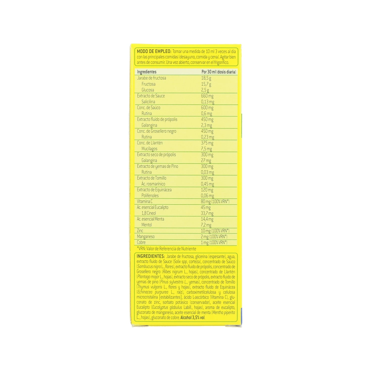EXTRAIT DE SAULE, CONCENTRÉ DE SUREAU, EXTRAIT FLUIDE DE PROPOLIS, CONCENTRÉ DE CASSIS, CONCENTRÉ DE PLANTAIN, EXTRAIT SEC DE PROPOLYS, EXTRAIT DE BOURGEONS DE PIN, CONCENTRÉ DE THYM 3, EXTRAIT D'ÉCHINACÉE, VITAMINE C, HUILE ESSENTIELLE D'EUCALYPTUS, HUILE ESSENTIELLE DE MENTHE POIVRÉE, GLUCONATE DE ZINC, GLUCONATE DE MANGANÈSE, GLUCONATE DE CUIVRE.