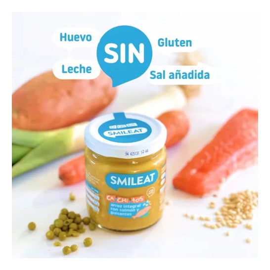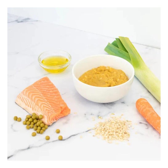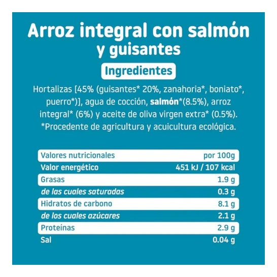 Pot d'alimentation écologique présentée en morceaux. Indiqué pour les repas de croissance des bébés. Recommandé vers des âges plus avancés qui aident au développement psychomoteur en introduisant de nouvelles textures. Il est composé d'une recette avec une saveur de poisson équilibrée, du saumon et de petit cache de riz brun sans écraser. De plus, il a varié des ingrédients de légumes tels que la pomme de terre, les poireaux, les pois, la carotte, l'oignon et l'huile d'olive extra vierge.
