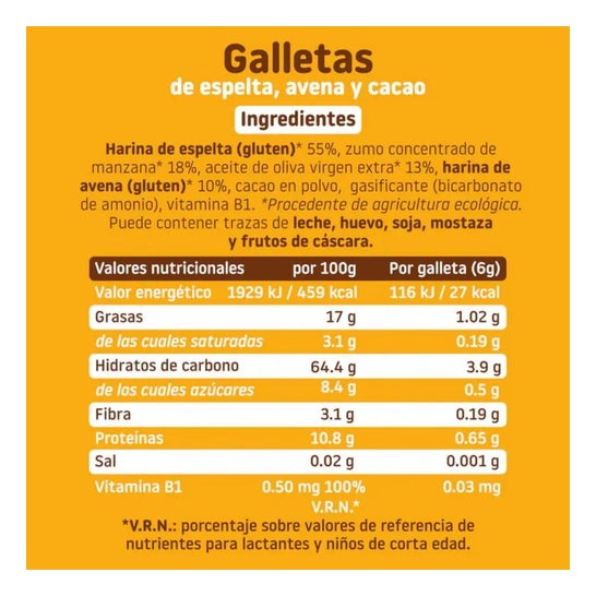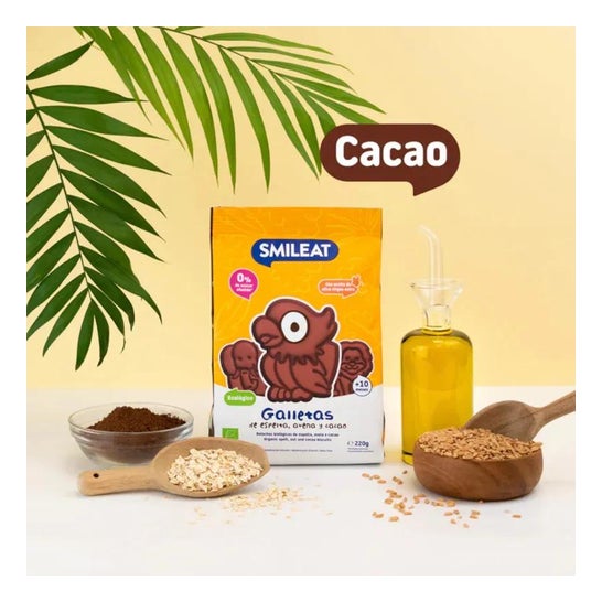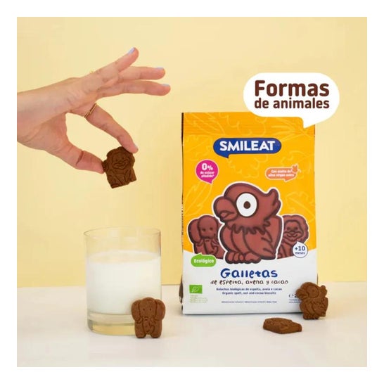 Smileat Biscuits Éco Épeautre Avoine et Cacao 220g Les biscuits Cacao, Avoine et Épeautre ÉCO de Smileat sont de délicieux biscuits sains élaborés avec des ingrédients écologiques et naturels. Idéaux comme collation pour les enfants, ces biscuits ne contiennent pas de sucre ajouté et sont préparés avec de l'huile d'olive extra vierge. Avec des saveurs amusantes et des formes d'animaux qui fascineront les plus petits. Ces biscuits écologiques pour enfants au cacao, à l'avoine et à l'épeautre sont conçus pour toute la famille.